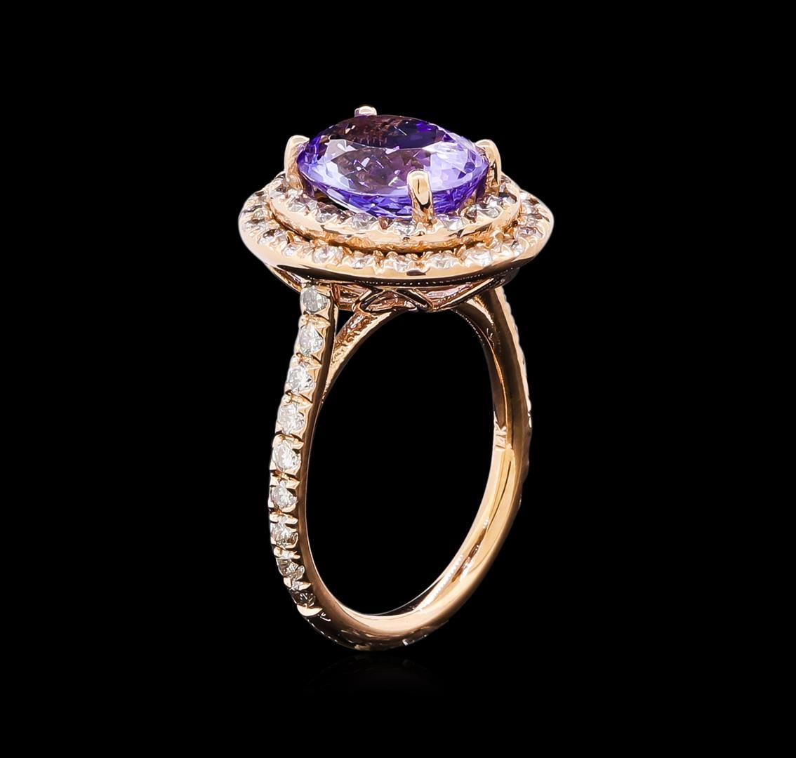 One electronically tested 14KT rose gold ladies cast tanzanite and diamond ring with a bright polish finish. The featured tanzanite is set within tiered diamond bezels supported by a tuliped under gallery and diamond ribbon shoulders, completed by a two millimeter wide band. Identified with markings of "14K". Condition is new, good workmanship. Containing: One prong set oval mixed cut natural tanzanite, measuring 10.90 x 8.90 x 5.79mm, 5%. bulge factor, approximate weight of 4.15ct., clarity is eye clean, type I, medium, very slightly grayish, bluish violet color, (GIA bV 5/3), cut is good. Transmitting light with no distortion, transparent. Graded in the setting. Tanzanite is a very rare gemstone that is only found in the country of Tanzania. Originally discovered in 1967. Tiffany & Company, named the stone Tanzanite. It is found in the Usumburu Mountains that border the Umba Valley of northern Tanzania. Tanzanite occurs in gray, brown, violet, blue, reddish-purple, & green. The gem is interesting because of its exceptional pleochroism. Rotated in different directions a tanzanite will exhibit multiple changes of color. Tanzanite has a low tolerance to ultrasonic cleaning, and should not be cleaned using this method. Fifty-Six prong set round brilliant cut diamonds, measuring 1.90 - 1.80 x 1.11mm (depth est.) approximate total weight of 56 Stones = 1.39ct. Graded in the setting. Clarity: SI-2 to I-2. Color: G - I. Total Weight of Colored Stones 4.15ct. Total Weight of Diamonds 1.39ct. Total Weight of Ring 5.90gm. AIG Appraised at $11,280.00.