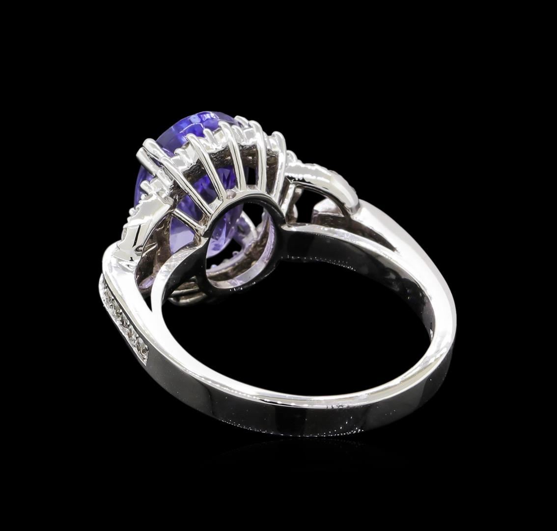 One electronically tested 14KT white gold lady's cast fashion ring with a cathedral shank basket halo with a bright polish finish. The featured lady's ring has a shank measuring 2.69 millimeters in width. Identified with markings of 'K14'. Condition is new, good workmanship. Containing: One prong set oval modified brilliant cut natural tanzanite, measuring 11.38 x 8.35 x 6.45mm, (depth est.) approximate weight of 4.15ct., clarity is eye clean, medium light, moderately strong, violetish blue color, (GIA vB 4/4), cut is very good. Transmitting light with no distortion, transparent. Colored gemstones are presumed to have been subjected to commonly used enhancement processes. Graded in the setting. Twenty-Eight prong set round brilliant cut diamonds, measuring 1.40 - 1.35 x 0.86mm (depth est.) approximate total weight of 28 Stones = 0.28ct. Graded in the setting. Clarity SI-1 to SI-2. Color: H - I Cut Good Eighteen prong set round brilliant cut diamonds, measuring 1.85 - 1.80 x 1.10mm (depth est.) approximate total weight of 18 Stones = 0.40ct. Graded in the setting. Clarity SI-1 to SI-2. Color: H - I Cut Good. Total Weight of Colored Stones 4.15ct.. Total Weight of Diamonds 0.68ct.. Total Weight of Ring 5.80gm. GAS Appraised at $8,160.00.