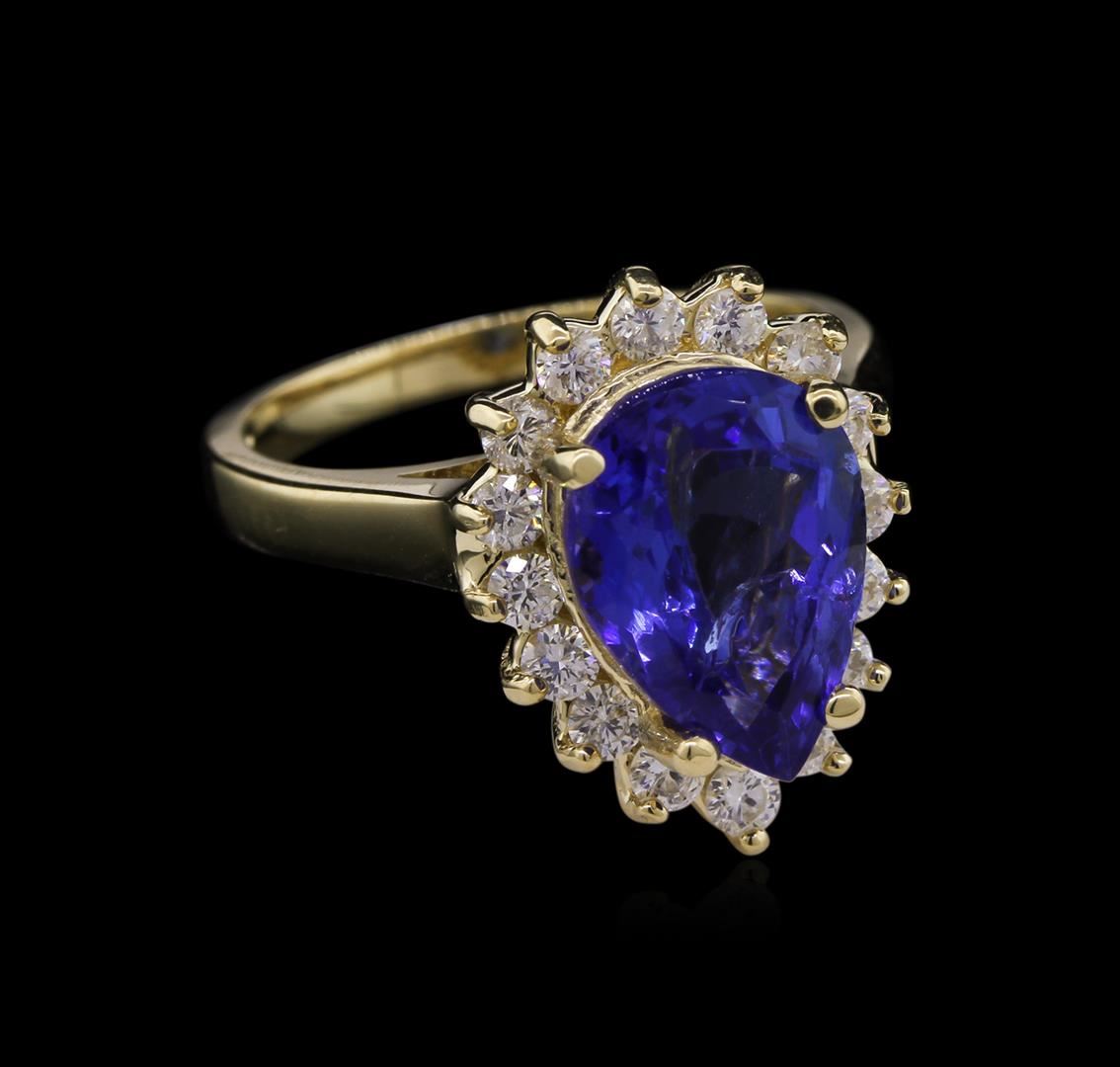 One electronically tested 14KT yellow gold lady's cast fashion ring with a basket halo with a bright polish finish. The featured lady's ring has a shank measuring 2.18 millimeters wide. Identified with markings of "14K". Condition is new, good workmanship. Containing: One prong set pear modified brilliant cut natural tanzanite, measuring 11.79 x 8.68 x 5.72mm, 5% bulge factor, approximate weight of 4.15ct., clarity is slightly included, type I, medium, very slightly grayish, violetish blue color, (GIA vB 5/3), cut is good. Transmitting light with a minimum of distortion, transparent. Colored gemstones are presumed to have been subjected to commonly used enhancement processes. Graded in the setting. Sixteen prong set round brilliant cut diamonds, measuring 2.20 - 2.15 x 1.37mm (depth est.) approximate total weight of 16 Stones = 0.64ct. Graded in the setting. Clarity: SI-1 to SI-2. Color: I - Good. Total Weight of Colored Stones 4.15ct. Total Weight of Diamonds 0.64ct. Total Weight of Ring 6.00gm. GAS Appraised at $7,670.00.