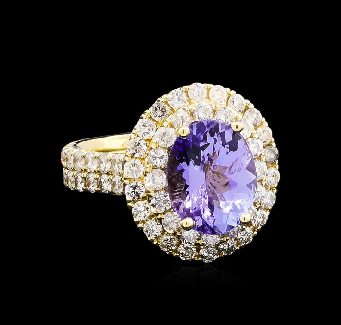 One electronically tested 14KT yellow gold ladies cast tanzanite and diamond ring with a bright polish finish. The featured tanzanite is set within tiered diamond bezels supported by a tuliped under gallery and diamond ribbon shoulders, completed by a four millimeter wide band. Condition is new, good workmanship. Containing: One prong set oval mixed cut natural tanzanite, measuring 10.90 x 8.90 x 5.79mm, 5%. bulge factor, approximate weight of 4.15ct., clarity is slightly included, type I, medium, very slightly grayish, violet color, (GIA V 5/3), cut is good. Transmitting light with a minimum of distortion, transparent. Naturally occurring internal & external characteristics are present. Graded in the setting. Tanzanite is a very rare gemstone that is only found in the country of Tanzania. Originally discovered in 1967. Tiffany & Company, named the stone Tanzanite. It is found in the Usumburu Mountains that border the Umba Valley of northern Tanzania. Tanzanite occurs in gray, brown, violet, blue, reddish-purple, & green. The gem is interesting because of its exceptional pleochroism. Rotated in different directions a tanzanite will exhibit multiple changes of color. Tanzanite has a low tolerance to ultrasonic cleaning, and should not be cleaned using this method. Seventy-Four prong set round brilliant cut diamonds, measuring 2.00 - 1.90 x 1.17mm (depth est.) approximate total weight of 74 Stones = 2.10ct. Graded in the setting. Clarity: SI-2 to I-2. Color: G - I. Total Weight of Colored Stones 4.15ct. Total Weight of Diamonds 2.10ct. Total Weight of Ring 7.98gm. AIG Appraised at $12,405.00.
