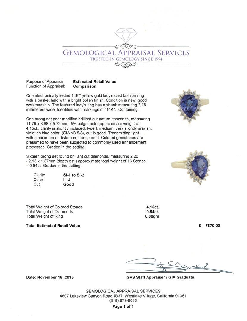 One electronically tested 14KT yellow gold lady's cast fashion ring with a basket halo with a bright polish finish. The featured lady's ring has a shank measuring 2.18 millimeters wide. Identified with markings of "14K". Condition is new, good workmanship. Containing: One prong set pear modified brilliant cut natural tanzanite, measuring 11.79 x 8.68 x 5.72mm, 5% bulge factor, approximate weight of 4.15ct., clarity is slightly included, type I, medium, very slightly grayish, violetish blue color, (GIA vB 5/3), cut is good. Transmitting light with a minimum of distortion, transparent. Colored gemstones are presumed to have been subjected to commonly used enhancement processes. Graded in the setting. Sixteen prong set round brilliant cut diamonds, measuring 2.20 - 2.15 x 1.37mm (depth est.) approximate total weight of 16 Stones = 0.64ct. Graded in the setting. Clarity: SI-1 to SI-2. Color: I - Good. Total Weight of Colored Stones 4.15ct. Total Weight of Diamonds 0.64ct. Total Weight of Ring 6.00gm. GAS Appraised at $7,670.00.