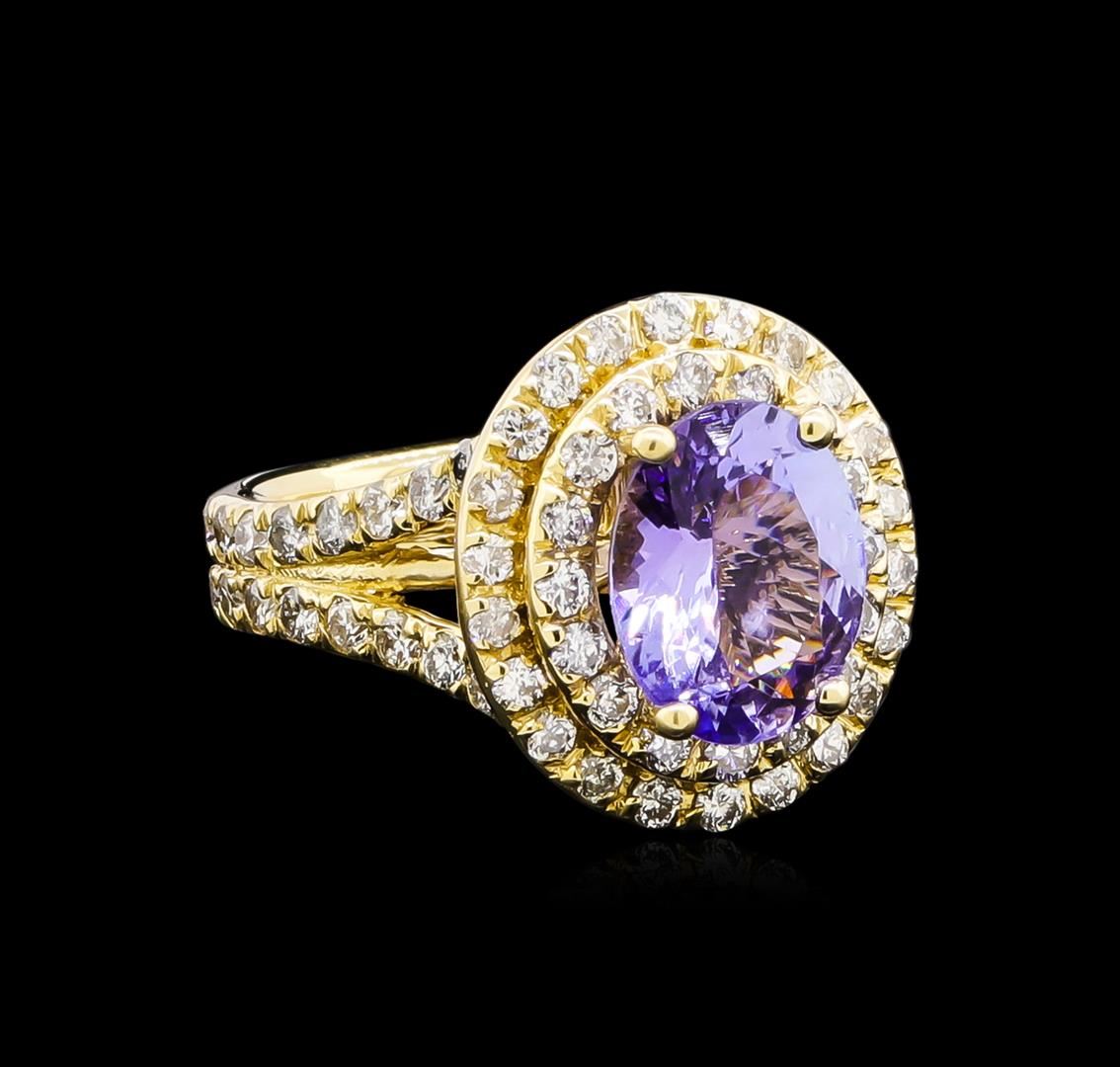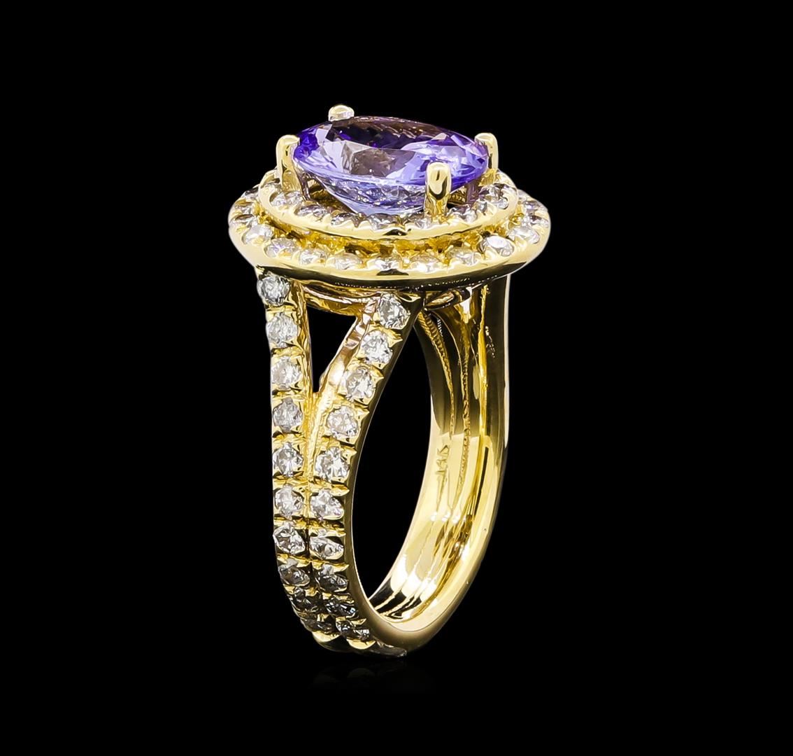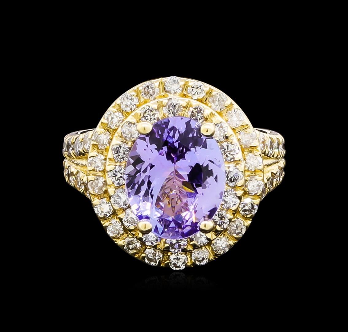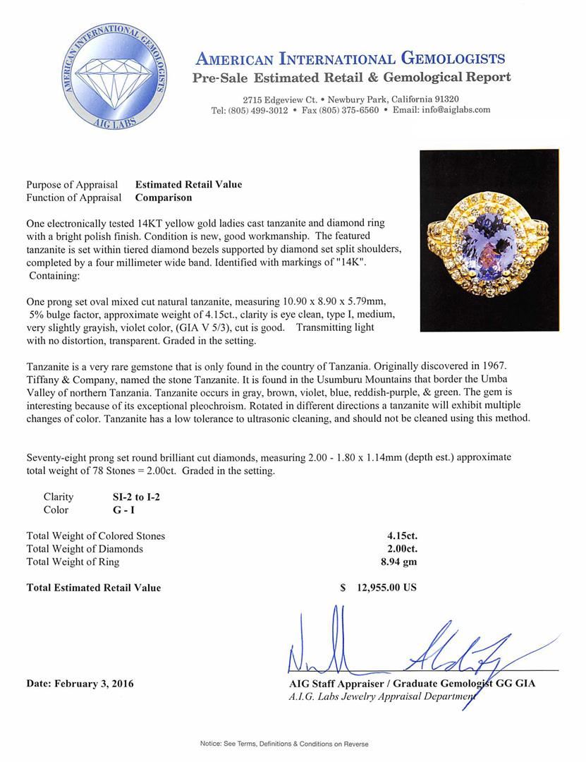 One electronically tested 14KT yellow gold ladies cast tanzanite and diamond ring with a bright polish finish. The featured tanzanite is set within tiered diamond bezels supported by diamond set split shoulders, completed by a four millimeter wide band. Identified with markings of "14K". Condition is new, good workmanship. Containing: One prong set oval mixed cut natural tanzanite, measuring 10.90 x 8.90 x 5.79mm, 5%. bulge factor, approximate weight of 4.15ct., clarity is eye clean, type I, medium, very slightly grayish, violet color, (GIA V 5/3), cut is good. Transmitting light with no distortion, transparent. Graded in the setting. Tanzanite is a very rare gemstone that is only found in the country of Tanzania. Originally discovered in 1967. Tiffany & Company, named the stone Tanzanite. It is found in the Usumburu Mountains that border the Umba Valley of northern Tanzania. Tanzanite occurs in gray, brown, violet, blue, reddish-purple, & green. The gem is interesting because of its exceptional pleochroism. Rotated in different directions a tanzanite will exhibit multiple changes of color. Tanzanite has a low tolerance to ultrasonic cleaning, and should not be cleaned using this method. Seventy-Eight prong set round brilliant cut diamonds, measuring 2.00 - 1.80 x 1.14mm (depth est.) approximate total weight of 78 Stones = 2.00ct. Graded in the setting. Clarity: SI-2 to I-2. Color: G - I. Total Weight of Colored Stones 4.15ct. Total Weight of Diamonds 2.00ct. Total Weight of Ring 8.94gm. AIG Appraised at $12,955.00.