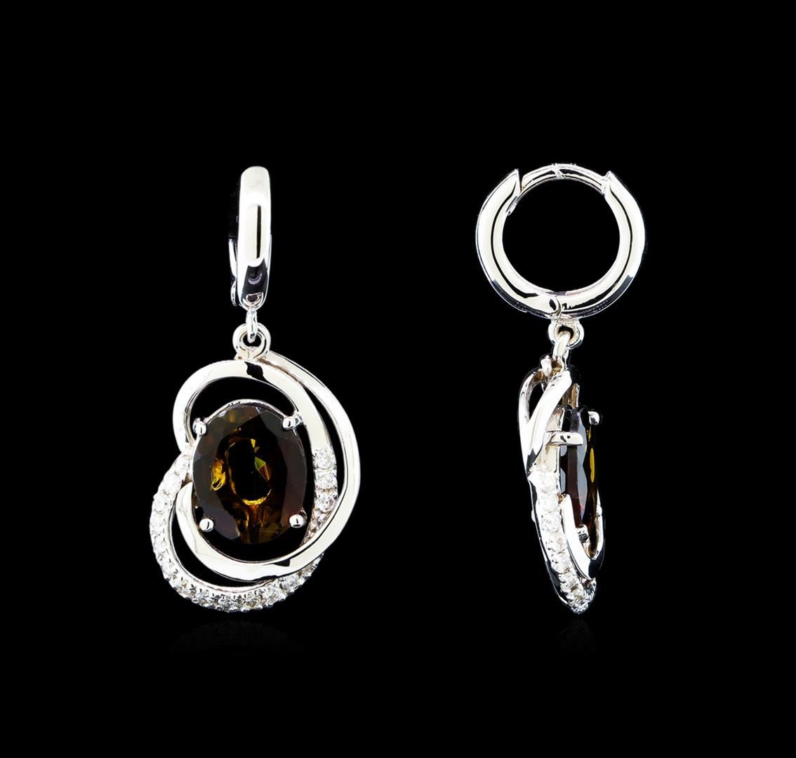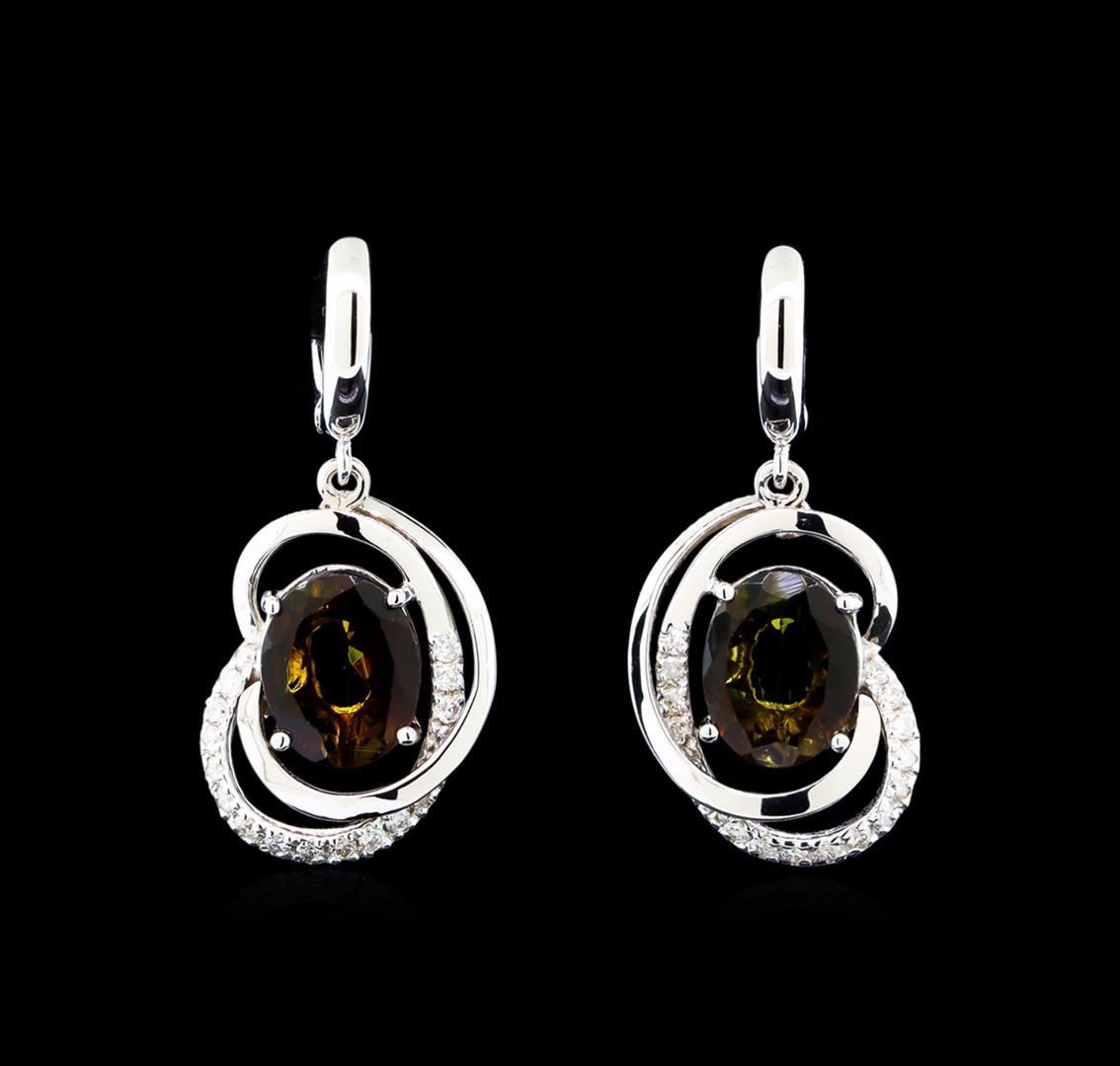 One pair of earrings featuring: 14KT white gold weighing 5.30 grams containing two tourmalines weighing 4.15ctw and diamonds weighing 0.42ctw.