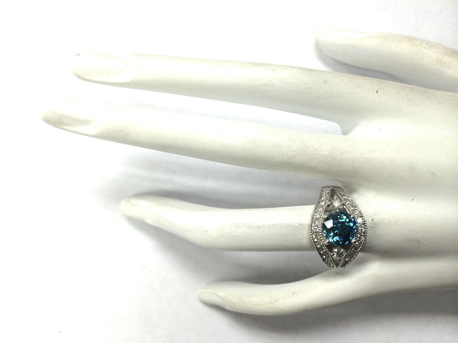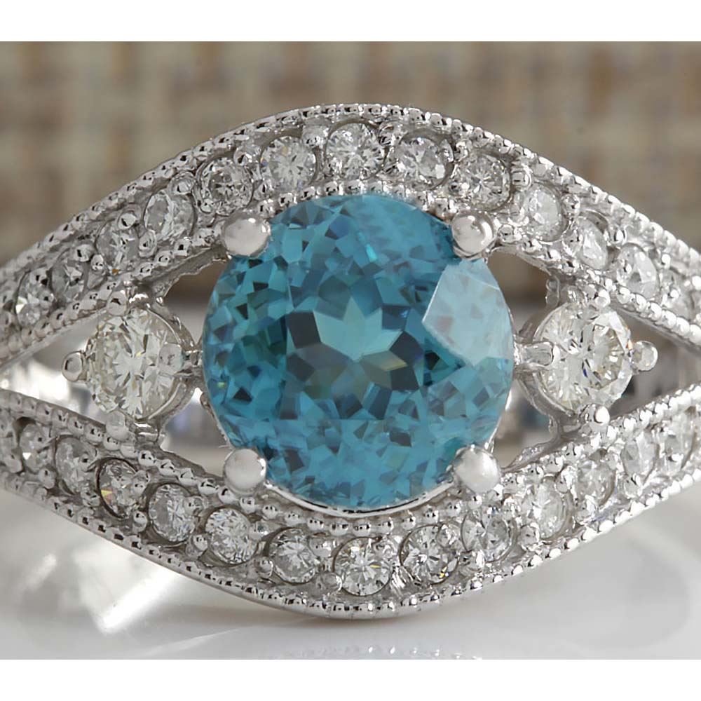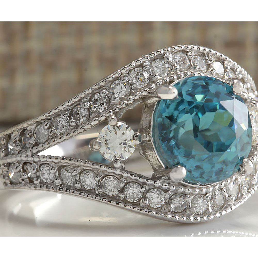 4.16 CTW Natural Blue Zircon And Diamond Ring 14K Solid White Gold