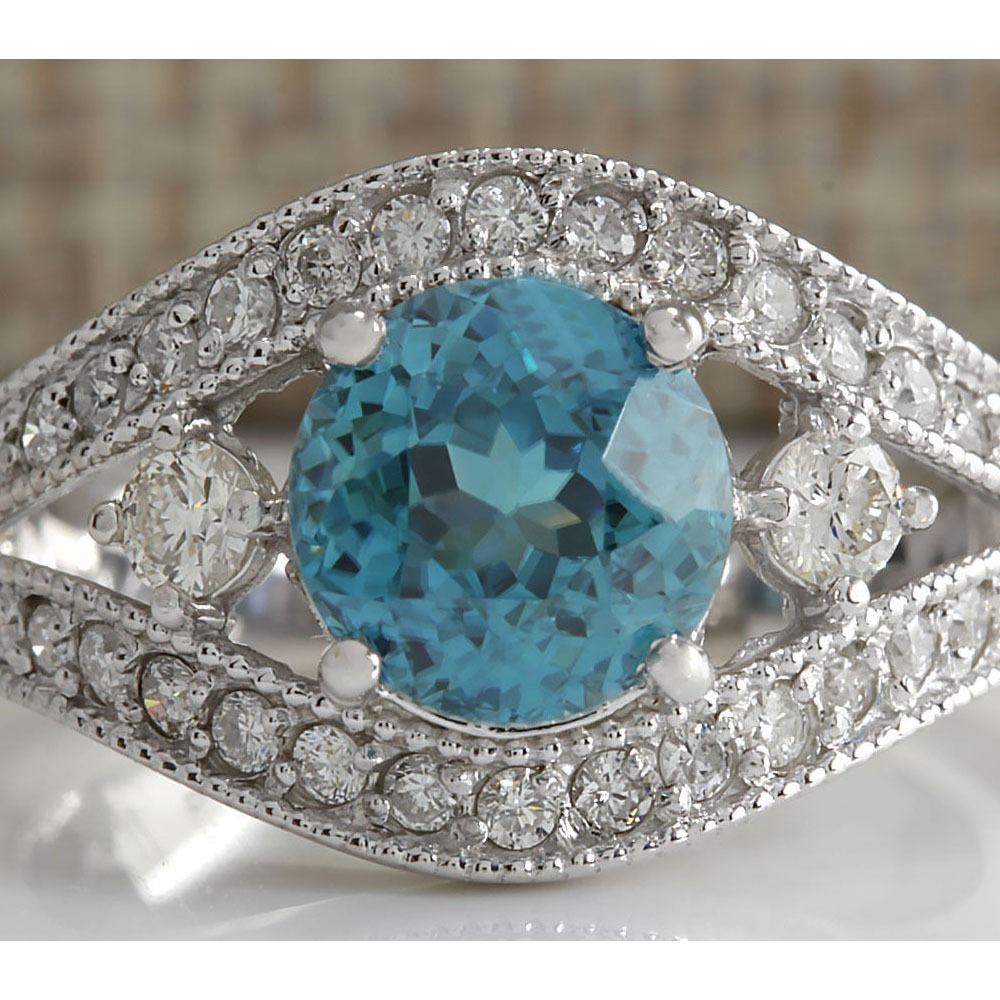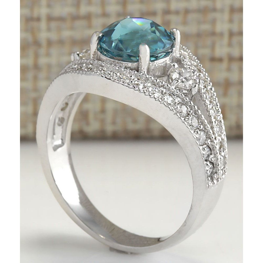4.16 CTW Natural Blue Zircon And Diamond Ring 18K Solid White Gold