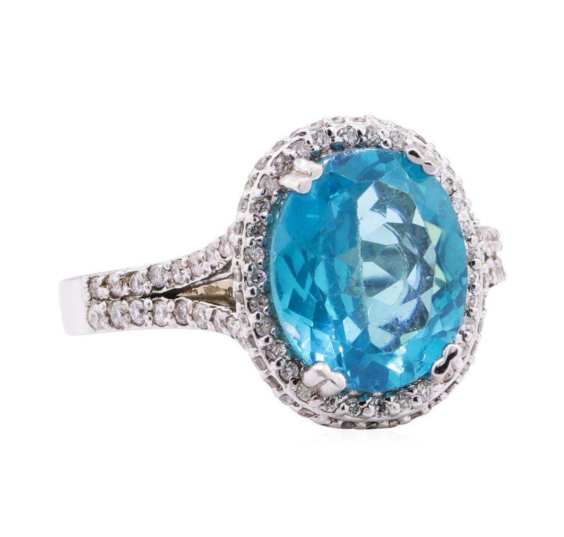 One electronically tested 14KT white gold lady's cast fashion ring with a split cathedral shank with a bright polish finish. The featured lady's ring has a shank measuring 2.30 millimeters wide. Identified with markings of 'K14'. Condition is new, good workmanship. Containing: One prong set oval modified mixed cut natural apatite, measuring 10.98 x 9.08 x 4.87mm, (depth est.) 10%. bulge factor, approximate weight of 3.62ct., clarity is slightly included, medium dark, strong, very slightly greenish blue color, (GIA vslgB 6/5), cut is good. Transmitting light with a minimum of distortion, transparent. Colored gemstones are presumed to have been subjected to commonly used enhancement processes. Graded in the setting. Thirty-Six prong set round brilliant cut diamonds, measuring 1.20 - 1.15 x 0.73mm (depth est.) approximate total weight of 36 Stones = 0.22ct. Graded in the setting. Color G - I Clarity SI-2 to I-1 Cut Good Eighty-Two prong set round brilliant cut diamonds, measuring 1.00 - 0.95 x 0.61mm (depth est.) approximate total weight of 82 Stones = 0.32ct. Graded in the setting. Color G - I Clarity SI-2 to I-1 Cut Good. Total Weight of Colored Stones 3.62ct.. Total Weight of Diamonds 0.54ct.. Total Weight of Ring 5.40gm GAS Appraised at $4005.00. GAS Appraised.