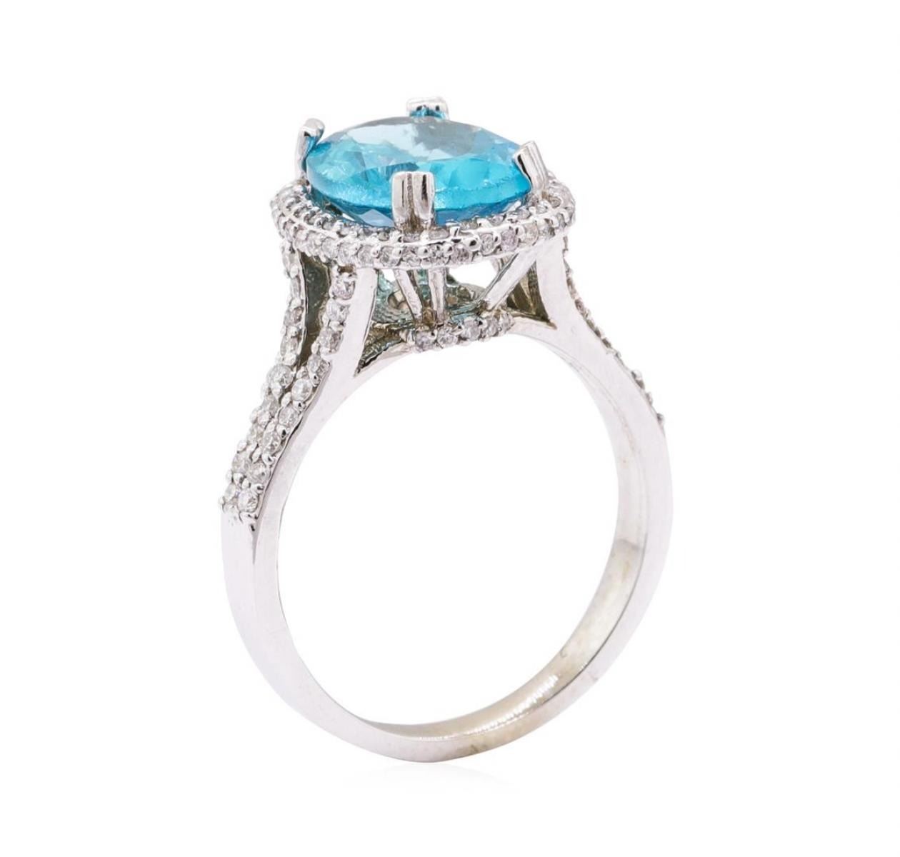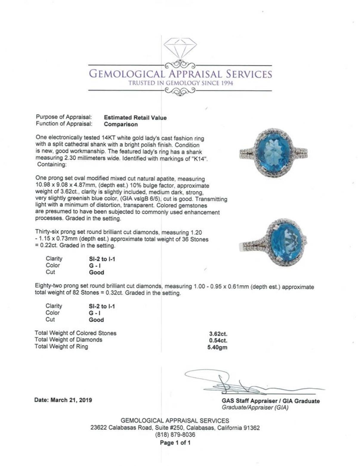 One electronically tested 14KT white gold lady's cast fashion ring with a split cathedral shank with a bright polish finish. The featured lady's ring has a shank measuring 2.30 millimeters wide. Identified with markings of 'K14'. Condition is new, good workmanship. Containing: One prong set oval modified mixed cut natural apatite, measuring 10.98 x 9.08 x 4.87mm, (depth est.) 10%. bulge factor, approximate weight of 3.62ct., clarity is slightly included, medium dark, strong, very slightly greenish blue color, (GIA vslgB 6/5), cut is good. Transmitting light with a minimum of distortion, transparent. Colored gemstones are presumed to have been subjected to commonly used enhancement processes. Graded in the setting. Thirty-Six prong set round brilliant cut diamonds, measuring 1.20 - 1.15 x 0.73mm (depth est.) approximate total weight of 36 Stones = 0.22ct. Graded in the setting. Color G - I Clarity SI-2 to I-1 Cut Good Eighty-Two prong set round brilliant cut diamonds, measuring 1.00 - 0.95 x 0.61mm (depth est.) approximate total weight of 82 Stones = 0.32ct. Graded in the setting. Color G - I Clarity SI-2 to I-1 Cut Good. Total Weight of Colored Stones 3.62ct.. Total Weight of Diamonds 0.54ct.. Total Weight of Ring 5.40gm GAS Appraised at $4005.00. GAS Appraised.
