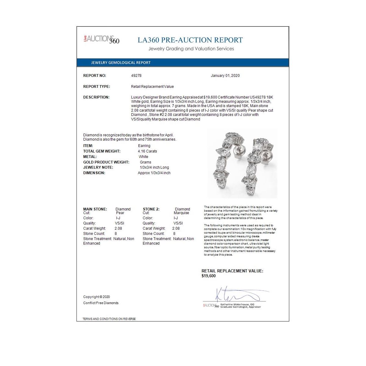 All sales are final, placing a bid is a legally binding obligation. All lots are sold as is, where is, with all the faults, imperfections, omissions and errors in the written description, estimates, appraisals, graphics and photography. USJL is not responsible for any errors or omissions in the description, graphics or photography provided or in the bidding software. Due diligence to verify the condition and description of a lot is the sole responsibility of the Bidder prior to placing any bid. Returns may only be made with the advance written authorization of USJL and are in USJL's sole discretion to approve. To request a return you must provide a written request fully explaining the basis for the return no later than 4 days after your receipt of the lot. Under no circumstances will any amounts other than the winning bid amount be refunded. A restocking charge of 19% of the full invoice amount may apply in USJL 's sole discretion. Any allowed returns must be received in exactly the same condition as when originally shipped to Buyer, or they will be returned to buyer at Buyer's cost. Any unauthorized returns will be refused. DELIVERY REFUSAL OF ITEMS SHIPPED BY US JEWELRY LIQUIDATION TO THE BIDDER CONSTITUTES AN UNAUTHORIZED RETURN IN DIRECT VIOLATION OF THESE GENERAL TERMS AND CONDITIONS.