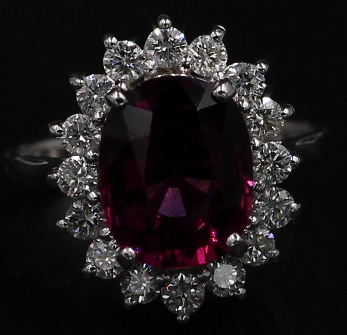 One lady's anniversary band ring featuring: 14KT white gold weighing 4.96 grams containing one rhodolite garnet weighing 4.16ct and 16 diamonds weighing 0.81ctw. The garnet is cut into an oval shape with good clarity, red color and very good cut. The diam