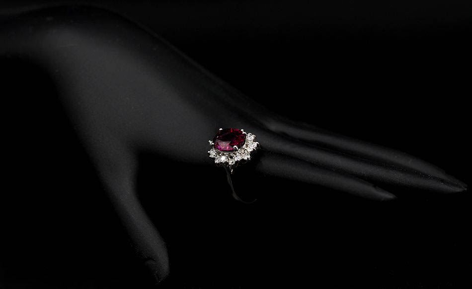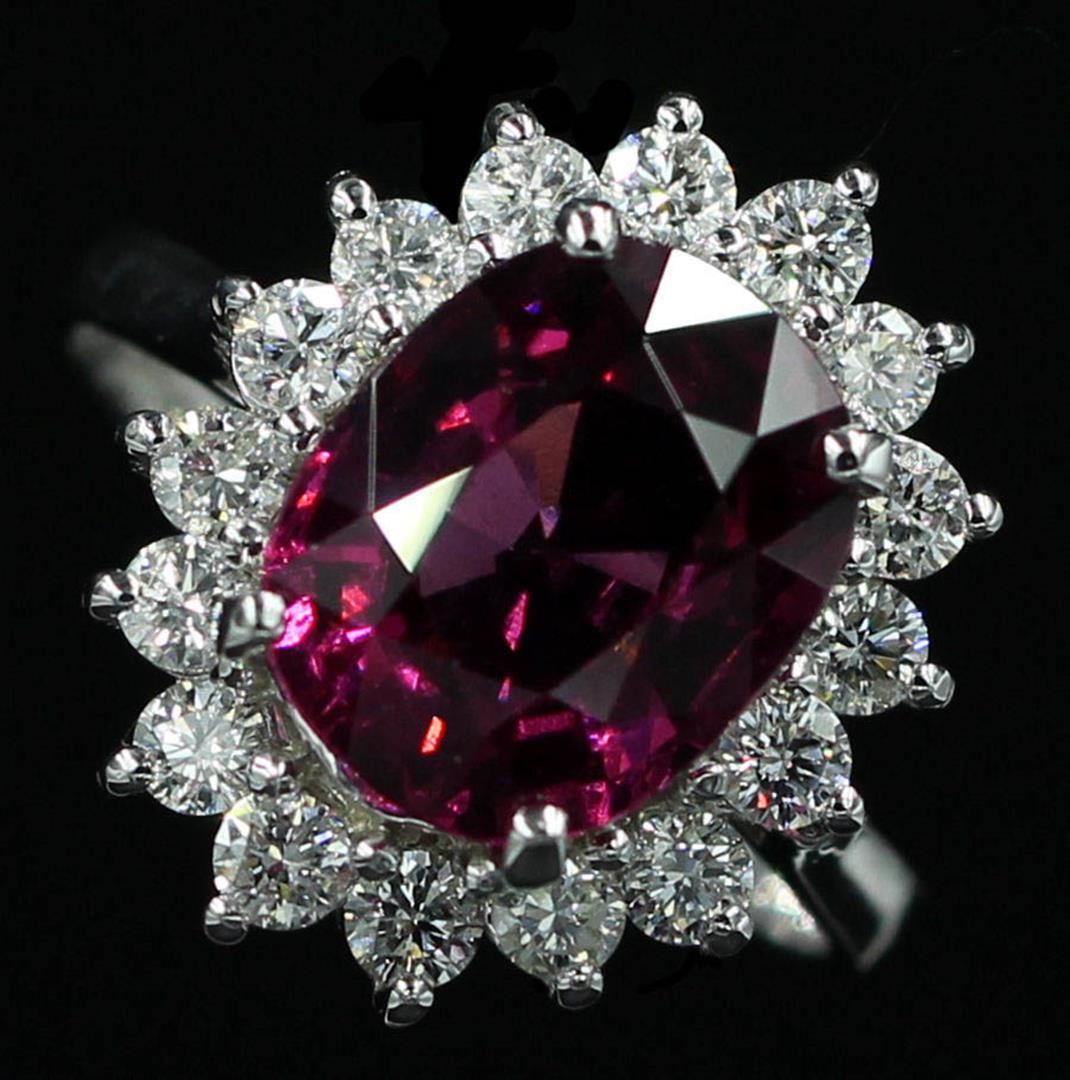 One lady's anniversary band ring featuring: 14KT white gold weighing 4.96 grams containing one rhodolite garnet weighing 4.16ct and 16 diamonds weighing 0.81ctw. The garnet is cut into an oval shape with good clarity, red color and very good cut. The diam
