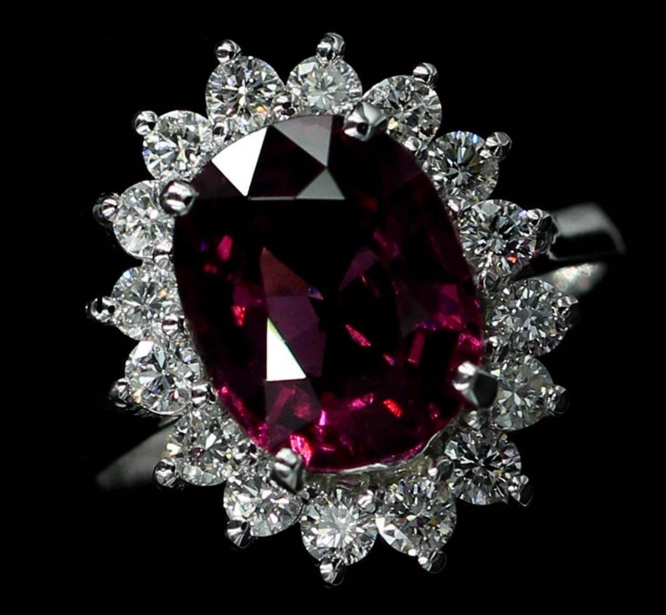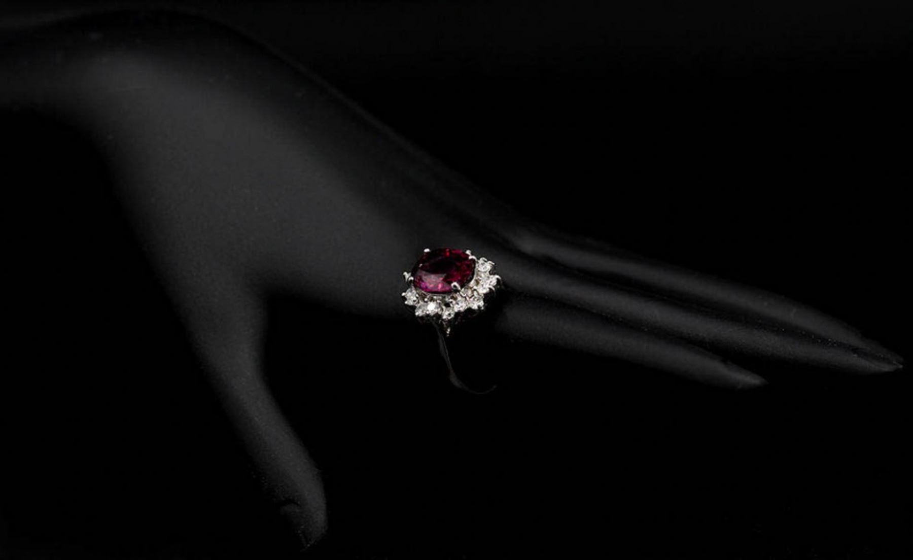 One lady's anniversary band ring featuring: 14KT white gold weighing 4.96 grams containing one rhodolite garnet weighing 4.16ct and 16 diamonds weighing 0.81ctw. The garnet is cut into an oval shape with good clarity, red color and very good cut. The diamonds are round brilliant cut and are natural, unenhanced stones with SI-1 clarity, G color and very good cut. The ring is a size 6.5 but can be resized.