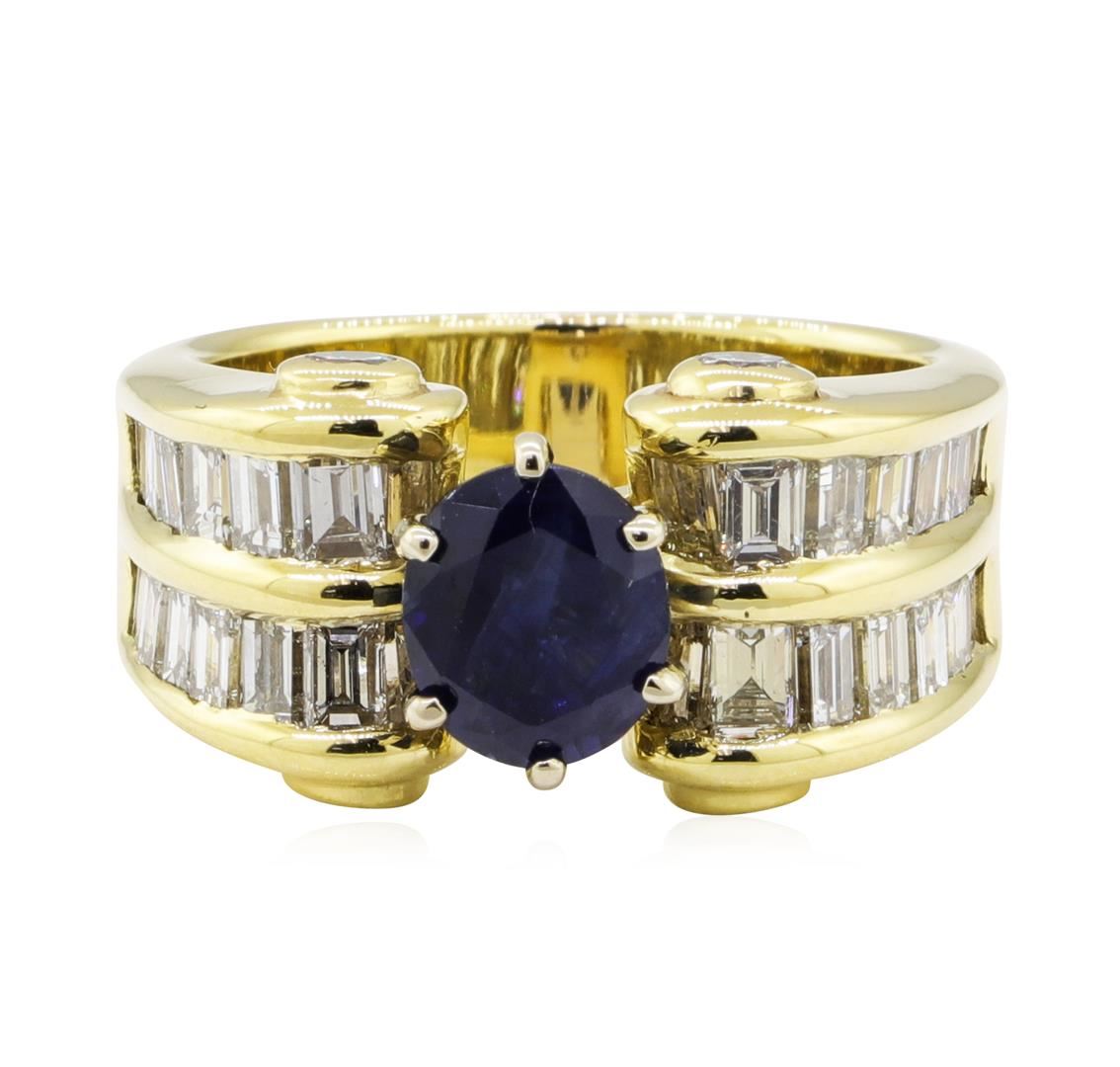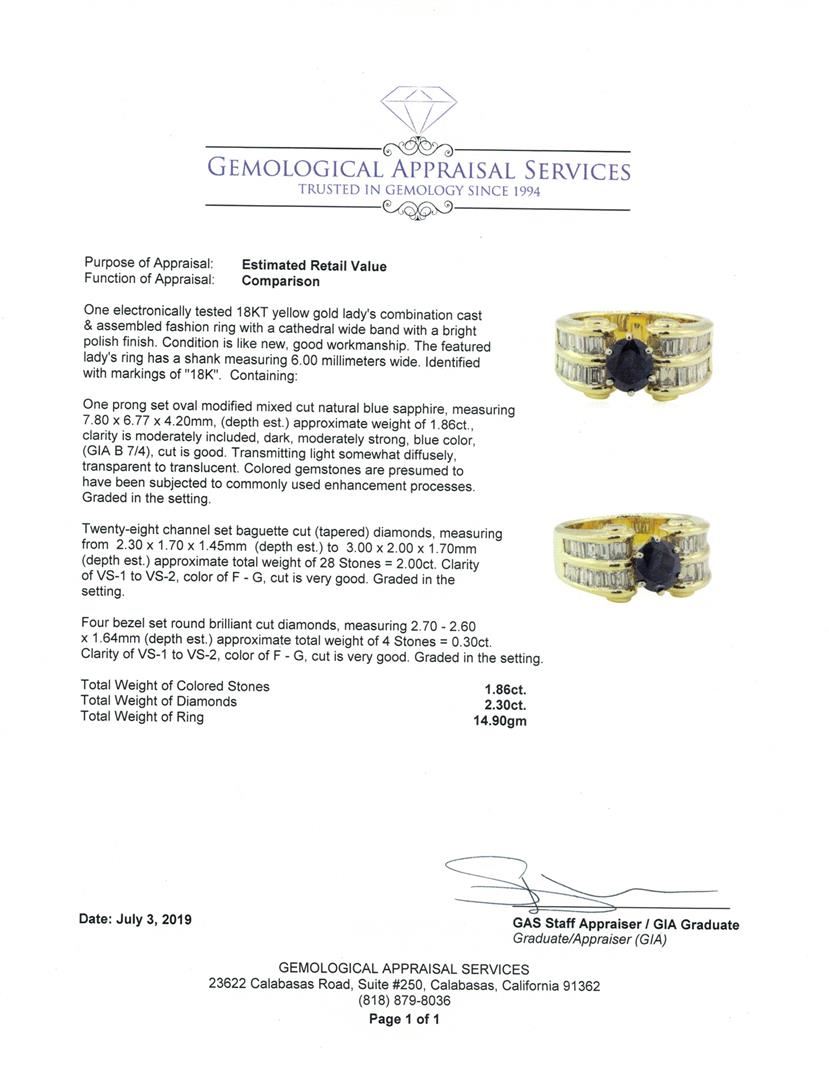 One electronically tested 18KT yellow gold lady's combination cast & assembled fashion ring with a cathedral wide band with a bright polish finish. The featured lady's ring has a shank measuring 6.00 millimeters wide. Identified with markings of '18K'. Condition is like new, good workmanship. Containing: One prong set oval modified mixed cut natural blue sapphire, measuring 7.80 x 6.77 x 4.20mm, (depth est.) approximate weight of 1.86ct., clarity is moderately included, dark, moderately strong, blue color, (GIA B 7/4), cut is good. Transmitting light somewhat diffusely, transparent to translucent. Colored gemstones are presumed to have been subjected to commonly used enhancement processes. Graded in the setting. Twenty-Eight channel set baguette cut (tapered) diamonds, measuring from 2.30 x 1.70 x 1.45mm (depth est.) to 3.00 x 2.00 x 1.70mm (depth est.) approximate total weight of 28 Stones = 2.00ct. Graded in the setting. Color F - G Clarity VS-1 to VS-2 Cut Very Good Four bezel set round brilliant cut diamonds, measuring 2.70 - 2.60 x 1.64mm (depth est.) approximate total weight of 4 Stones = 0.30ct. Graded in the setting. Color F - G Clarity VS-1 to VS-2 Cut Very Good. Total Weight of Colored Stones 1.86ct.. Total Weight of Diamonds 2.30ct.. Total Weight of Ring 14.90gm GAS Appraised at $9745.00. GAS Appraised.