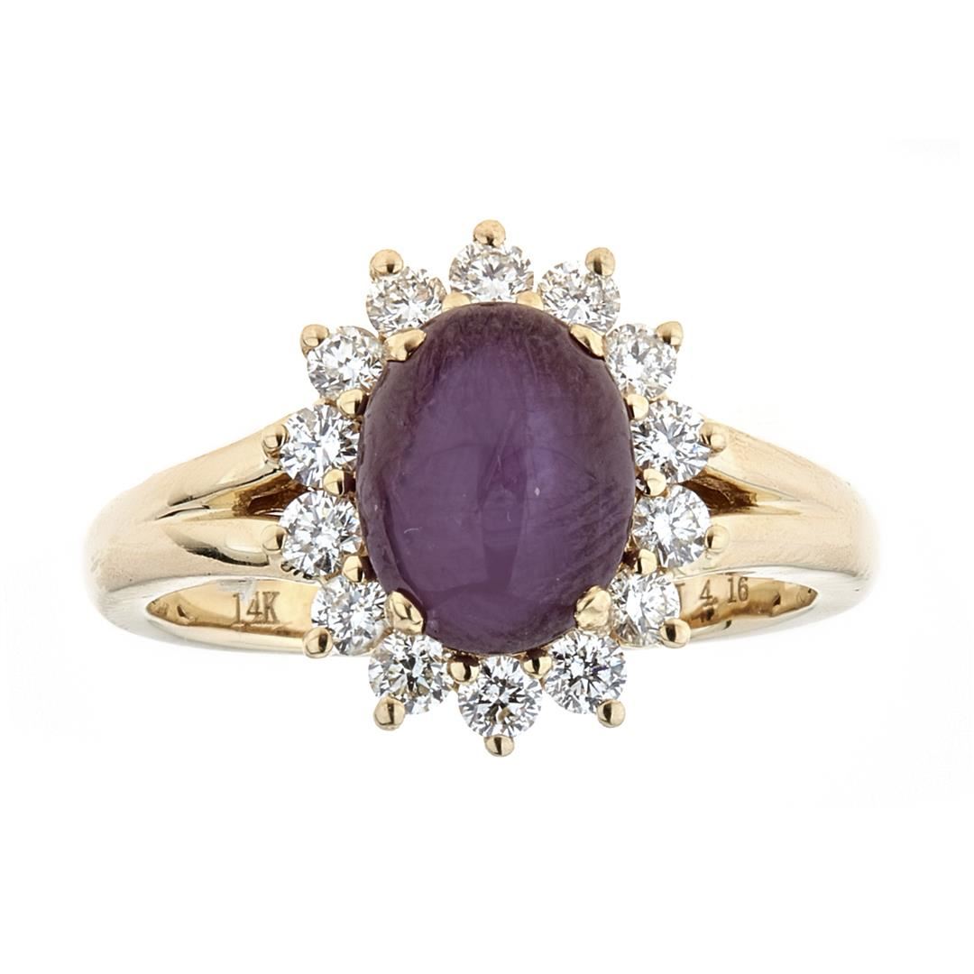 One Lady's Star Ruby and Diamond Ring. Setting: 14 Kt. Yellow Gold Mounting. Additional: 14 Round Diamonds = 0.55 Cts. TWT (G-H/SI). Center Gem Stone Information: Species: Natural Corundum. Variety: Star Ruby. Phenomenon: Asterism (6 Ray Star). Shape and Cut: Cabochon. Measurements: 9.06 x 7.05 x 5.90 mm. Weight: 4.16 Carats. Transparency: Semi-Translucent. Color Hue: Purplish Red. Saturation: Moderately Strong. Total Weight: 4.14 grams.