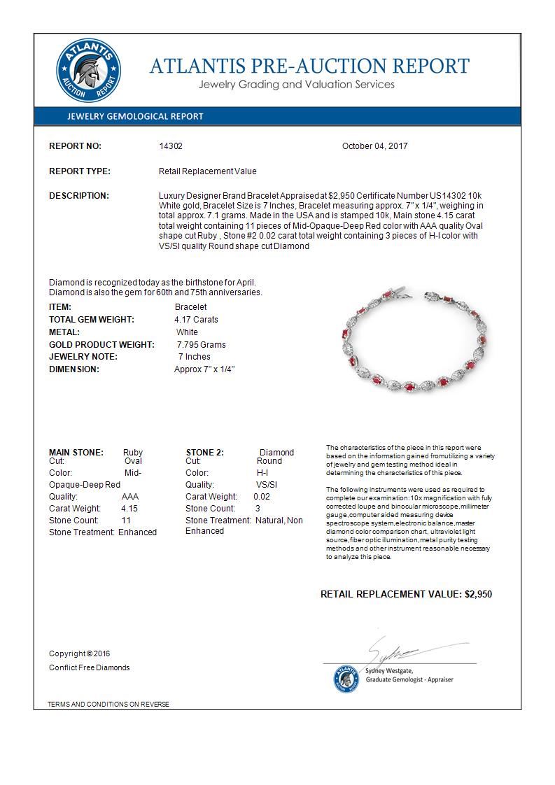 14302 - REF-44Y7X ---- 4.17 CTW Ruby & Diamond Bracelet 10K White Gold ---- Luxury Designer Brand Bracelet Appraised at $2,950 Certificate Number US14302 10k White gold, Bracelet Size is 7 Inches, Bracelet measuring approx. 7" x 1/4", weighing in total approx. 7.1 grams. Made in the USA and is stamped 10k, Main stone 4.15 carat total weight containing 11 pieces of Mid-Opaque-Deep Red color with AAA quality Oval shape cut Ruby , Stone #2 0.02 carat total weight containing 3 pieces of H-I color with VS/SI quality Round shape cut Diamond