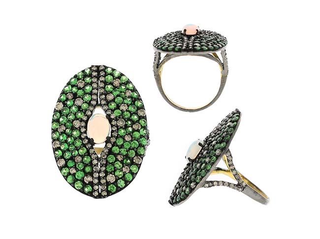 ETHIOPIANOPAL , TSAVORITE AND DIAMOND RING/Diamond Count 1:/Diamond Total Carat :1.25/Diamond Color & Clarity:J-L/I1-I2 Single Cut /Diamond Count 2:/Diamond 2 CTW:/Diamond Count 3:/Gemstone Count 1:/Gemstone CTW:2.92/Gemstone Dimension:/Gemstone Shape:CabuchonOPAL - Round-Tsavorite /Gemstone Count 2:/Gemstone Shape:/Ring Dimension:/Metal Type 1:18kYellow Gold :Gram Weight:1.43/Metal Type 2:over0.925Sterling Silver / Weight Gram:6/Gross Weight :8.16/Ring Size:7