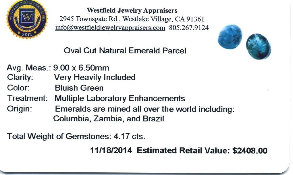 4.17cts. Oval Cut Natural Emerald Parcel Westfield Appraised at $2,408.00.