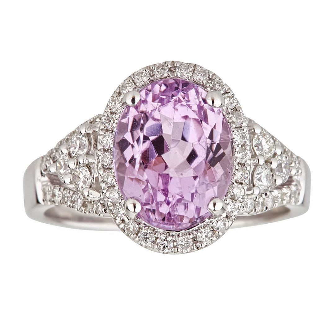 One Kunzite and Diamond Ring featuring: 14KT White Gold with a total weight of 5.25 grams, Kunzite with a total weight of 4.17ct, and 56 Round Cut Diamonds with a total weight of 0.57ctw.