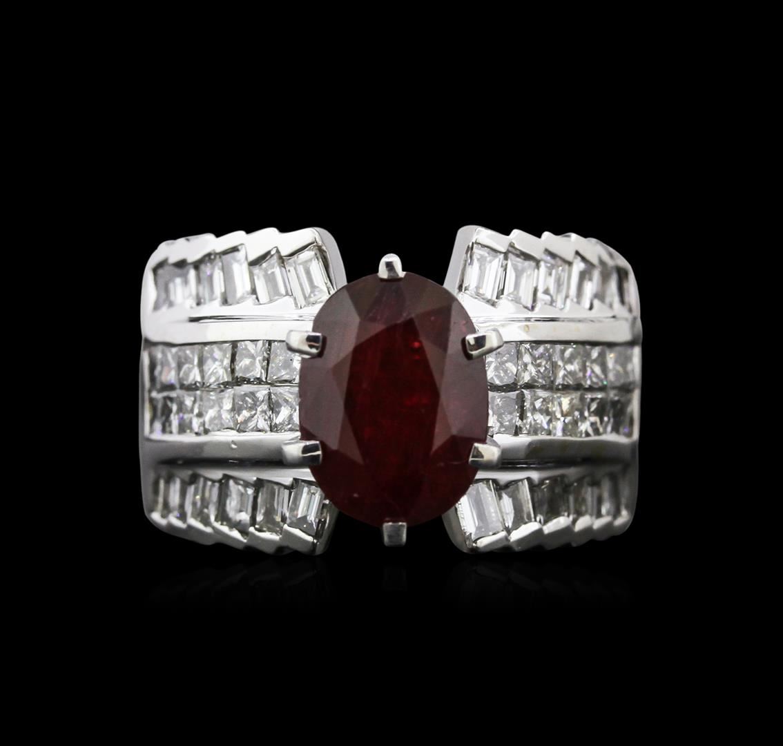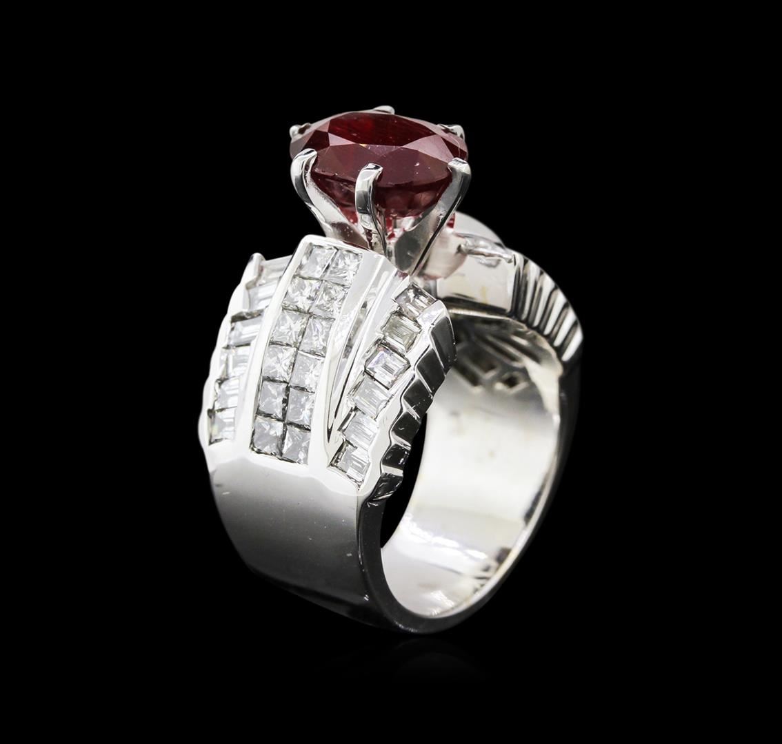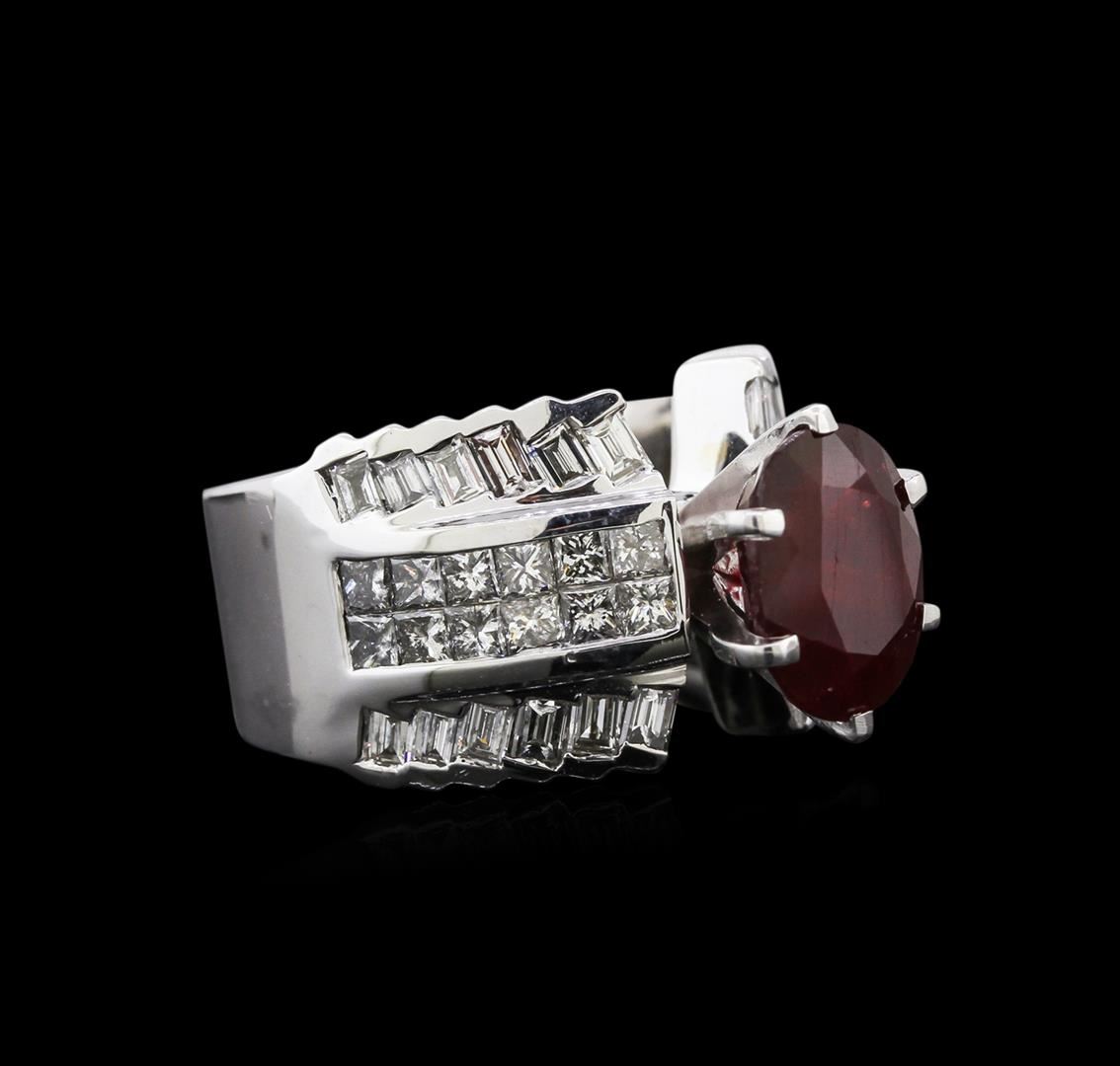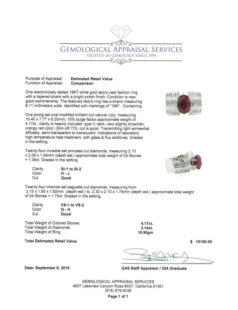 One electronically tested 18KT white gold lady's cast fashion ring with a tapered shank with a bright polish finish. The featured lady's ring has a shank measuring 8.11 millimeters wide. Identified with markings of "18K". Condition is new, good workmanship. Containing: One prong set oval modified brilliant cut natural ruby, measuring 10.40 x 7.77 x 5.20mm, 15% bulge factor, approximate weight of 4.17ct., clarity is heavily included, type II, dark, very slightly brownish, orangy red color, (GIA oR 7/3), cut is good. Transmitting light somewhat diffusely, semi-transparent to translucent. Indications of laboratory high temperature heat treatment, with glass & flux additives. Graded in the setting. Twenty-Four invisible set princess cut diamonds, measuring 2.10 x 2.05 x 1.54mm (depth est.) approximate total weight of 24 Stones = 1.39ct. Graded in the setting. Clarity: SI-1 to SI-2. Color: H - Good Twenty-Four channel set baguette cut diamonds, measuring from 2.15 x 1.90 x 1.62mm (depth est.) to 2.30 x 2.10 x 1.79mm (depth est.) approximate total weight of 24 Stones = 1.75ct. Graded in the setting. Clarity: VS-1 to VS-2. Color: G - Good. Total Weight of Colored Stones 4.17ct. Total Weight of Diamonds 3.14ct. Total Weight of Ring 18.90gm. GAS Appraised at $10,150.00.