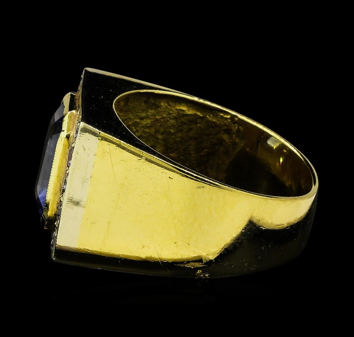 One electronically tested 18KT yellow gold cast sapphire and diamond ring. The featured sapphire is set between vertical diamond ribbons supported by tapering shoulders, completed by a six millimeter wide band. Bright finish with milgrain detailing. Identified with markings of '18K'. Condition is good. Containing: One bezel set rectangular step cut natural blue sapphire, measuring 10.90 x 7.70 x 4.60mm, approximate weight of 4.17ct., clarity is slightly included, type II, medium, very slightly grayish, violetish blue color, (GIA vB 5/3), cut is good. Transmitting light with a minimum of distortion, transparent. Naturally occurring internal & external characteristics are present. Indications of laboratory high temperature heat treatment. Graded in the setting. Ten prong set round brilliant cut diamonds, measuring 2.20 - 2.20 x 1.32mm (depth est.) approximate total weight of 10 Stones = 0.45ct. Graded in the setting. Clarity VS-2 to SI-2. Color: F - G. Total Weight of Colored Stones 4.17ct.. Total Weight of Diamonds 0.45ct.. Total Weight of Ring 10.76gm. AIG Appraised at $11,610.00.