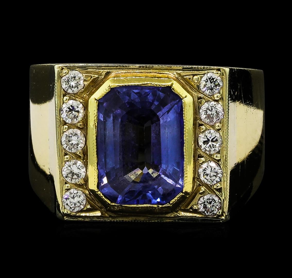 One electronically tested 18KT yellow gold cast sapphire and diamond ring. The featured sapphire is set between vertical diamond ribbons supported by tapering shoulders, completed by a six millimeter wide band. Bright finish with milgrain detailing. Identified with markings of '18K'. Condition is good. Containing: One bezel set rectangular step cut natural blue sapphire, measuring 10.90 x 7.70 x 4.60mm, approximate weight of 4.17ct., clarity is slightly included, type II, medium, very slightly grayish, violetish blue color, (GIA vB 5/3), cut is good. Transmitting light with a minimum of distortion, transparent. Naturally occurring internal & external characteristics are present. Indications of laboratory high temperature heat treatment. Graded in the setting. Ten prong set round brilliant cut diamonds, measuring 2.20 - 2.20 x 1.32mm (depth est.) approximate total weight of 10 Stones = 0.45ct. Graded in the setting. Clarity VS-2 to SI-2. Color: F - G. Total Weight of Colored Stones 4.17ct.. Total Weight of Diamonds 0.45ct.. Total Weight of Ring 10.76gm. AIG Appraised at $11,610.00.