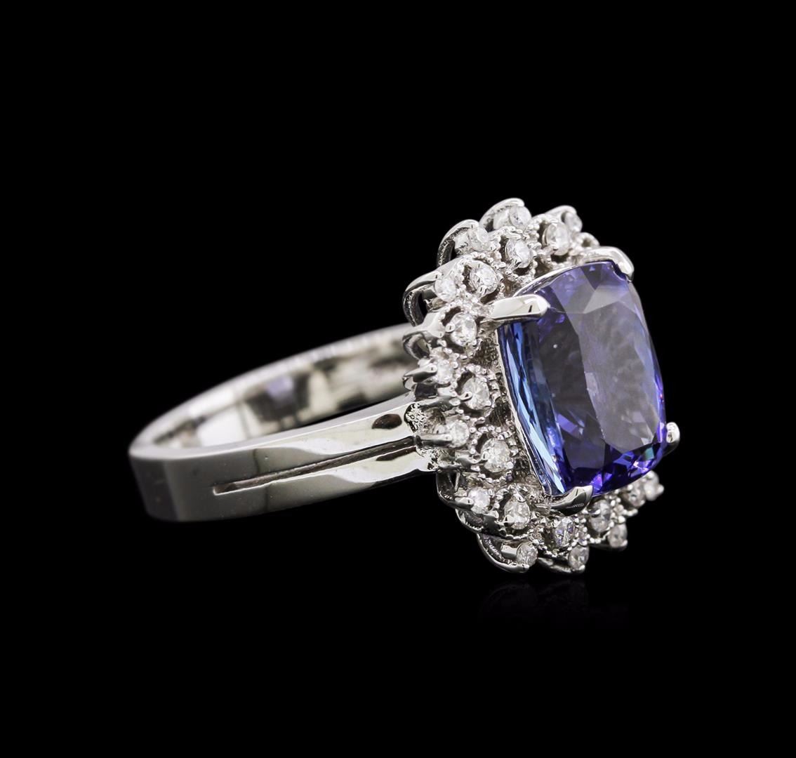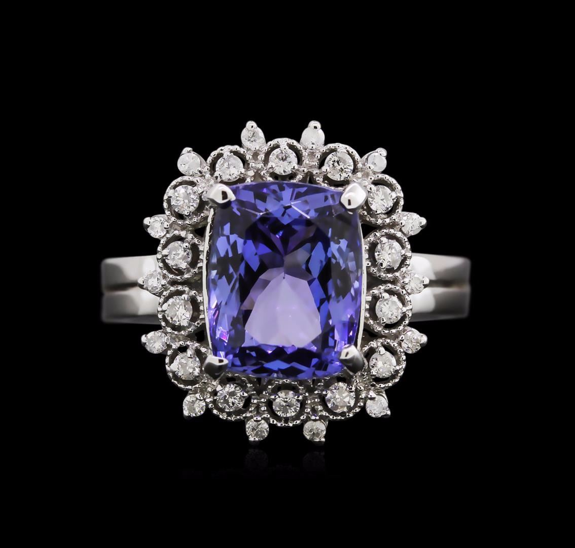 One electronically tested 14KT white gold lady's cast fashion ring with a basket double halo with a bright polish with milgrain detailing finish. The featured lady's ring has a shank measuring 3.00 millimeters wide. Identified with markings of "K14". Condition is new, good workmanship. Containing: One prong set rectangular cushion modified brilliant cut natural tanzanite, measuring 10.10 x 7.97 x 5.98mm, 10% bulge factor, approximate weight of 4.17ct., clarity is eye clean, type I, medium dark, very slightly grayish, bluish violet color, (GIA bV 6/3), cut is good. Transmitting light with no distortion, transparent. Colored gemstones are presumed to have been subjected to commonly used enhancement processes. Graded in the setting. Fourteen prong set round brilliant cut diamonds, measuring 1.60 - 1.55 x 1.03mm (depth est.) approximate total weight of 14 Stones = 0.22ct. Graded in the setting. Clarity: SI-2 to I-1. Color: H - I. Cut Good Fourteen prong set round brilliant cut diamonds, measuring 1.10 - 1.05 x 0.70mm (depth est.) approximate total weight of 14 Stones = 0.07ct. Clarity: SI-2 to I-1. Color: H - I. Cut Good. Total Weight of Colored Stones 4.17ct. Total Weight of Diamonds 0.29ct. Total Weight of Ring 6.80gm. GAS Appraised at $6,315.00.