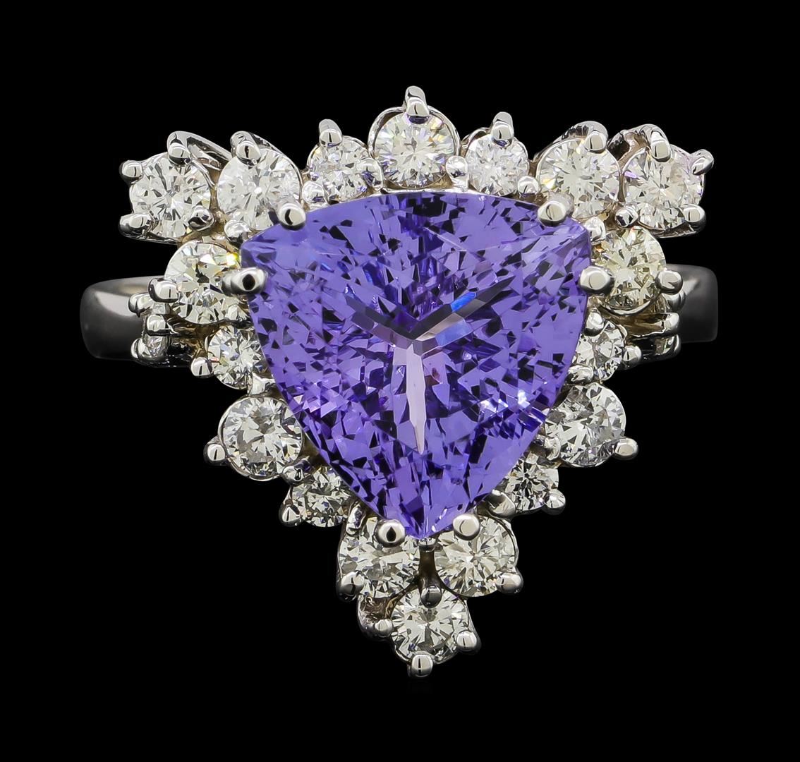 One electronically tested 14KT white gold lady's cast fashion ring with a basket halo with a bright polish finish. The featured lady's ring has a shank measuring 2.50 millimeters wide. Identified with markings of 'K14'. Condition is new, good workmanship. Containing: One prong set triangle modified brilliant cut natural tanzanite, measuring 10.30 x 10.10 x 6.35mm, (depth est.) 5%. bulge factor, approximate weight of 4.17ct., clarity is eye clean, medium light, moderately strong, violet color, (GIA V 4/4), cut is excellent. Transmitting light with no distortion, transparent. Colored gemstones are presumed to have been subjected to commonly used enhancement processes. Graded in the setting. Twelve prong set round brilliant cut diamonds, measuring 2.45 - 2.25 x 1.46mm (depth est.) approximate total weight of 12 Stones = 0.60ct. Graded in the setting. Clarity SI-1 to SI-3. Color: H - I Cut Good Ten prong set round brilliant cut diamonds, measuring 1.95 - 1.85 x 1.14mm (depth est.) approximate total weight of 10 Stones = 0.25ct. Graded in the setting. Clarity SI-1 to I-1. Color: G - H Cut Good. Total Weight of Colored Stones 4.17ct.. Total Weight of Diamonds 0.85ct.. Total Weight of Ring 5.40gm. GAS Appraised at $9,030.00.