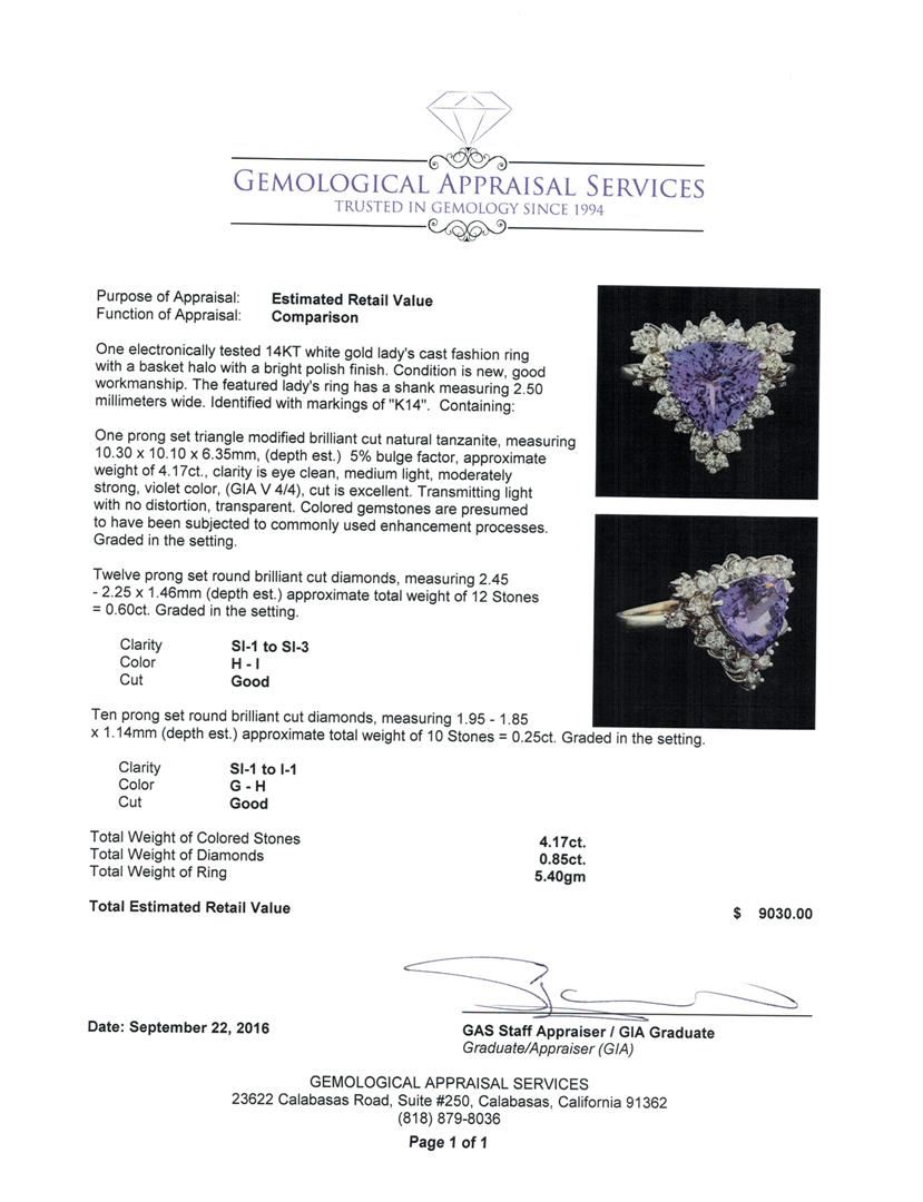 One electronically tested 14KT white gold lady's cast fashion ring with a basket halo with a bright polish finish. The featured lady's ring has a shank measuring 2.50 millimeters wide. Identified with markings of 'K14'. Condition is new, good workmanship. Containing: One prong set triangle modified brilliant cut natural tanzanite, measuring 10.30 x 10.10 x 6.35mm, (depth est.) 5%. bulge factor, approximate weight of 4.17ct., clarity is eye clean, medium light, moderately strong, violet color, (GIA V 4/4), cut is excellent. Transmitting light with no distortion, transparent. Colored gemstones are presumed to have been subjected to commonly used enhancement processes. Graded in the setting. Twelve prong set round brilliant cut diamonds, measuring 2.45 - 2.25 x 1.46mm (depth est.) approximate total weight of 12 Stones = 0.60ct. Graded in the setting. Clarity SI-1 to SI-3. Color: H - I Cut Good Ten prong set round brilliant cut diamonds, measuring 1.95 - 1.85 x 1.14mm (depth est.) approximate total weight of 10 Stones = 0.25ct. Graded in the setting. Clarity SI-1 to I-1. Color: G - H Cut Good. Total Weight of Colored Stones 4.17ct.. Total Weight of Diamonds 0.85ct.. Total Weight of Ring 5.40gm. GAS Appraised at $9,030.00.