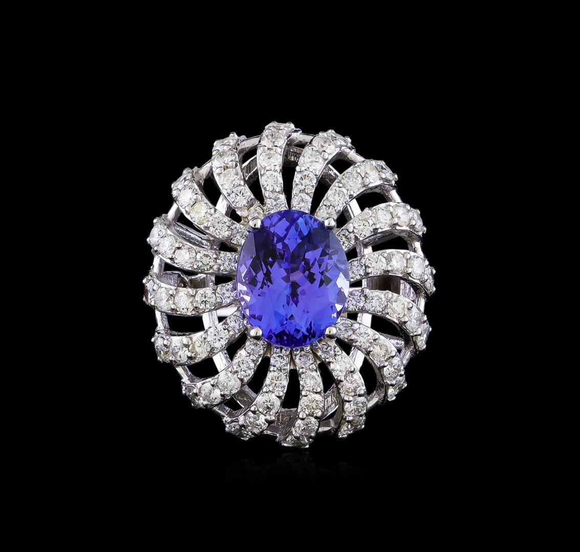 One electronically tested 14KT white gold lady's cast fashion ring with a basket halo with a bright polish finish. The featured lady's ring has a shank measuring 2.01 millimeters in width. Identified with markings of "K14". Condition is new, good workmanship. Containing: One prong set oval oval modified brilliant cut natural tanzanite, measuring 10.90 x 8.89 x 6.01mm, (depth est.) approximate weight of 4.17ct., clarity is eye clean, medium, moderately strong, violetish blue color, (GIA vB 5/4), cut is very good. Transmitting light with no distortion, transparent. Colored gemstones are presumed to have been subjected to commonly used enhancement processes. Graded in the setting. Sixteen prong set round brilliant cut diamonds, measuring 2.30 - 2.20 x 1.37mm (depth est.) approximate total weight of 16 Stones = 0.68ct. Graded in the setting. Clarity: SI-1 to SI-2. Color: H - I. Cut Good Forty-Eight prong set round brilliant cut diamonds, measuring 1.90 - 1.80 x 1.15mm (depth est.) approximate total weight of 48 Stones = 1.17ct. Graded in the setting. Clarity: SI-1 to SI-2. Color: H - I. Cut Good Sixteen prong set round brilliant cut diamonds, measuring 1.60 - 1.50 x 0.96mm (depth est.) approximate total weight of 16 Stones = 0.23ct. Graded in the setting. Clarity: SI-1 to SI-2. Color: G - Good. Total Weight of Colored Stones 4.17ct. Total Weight of Diamonds 2.08ct. Total Weight of Ring 9.70gm. GAS Appraised.