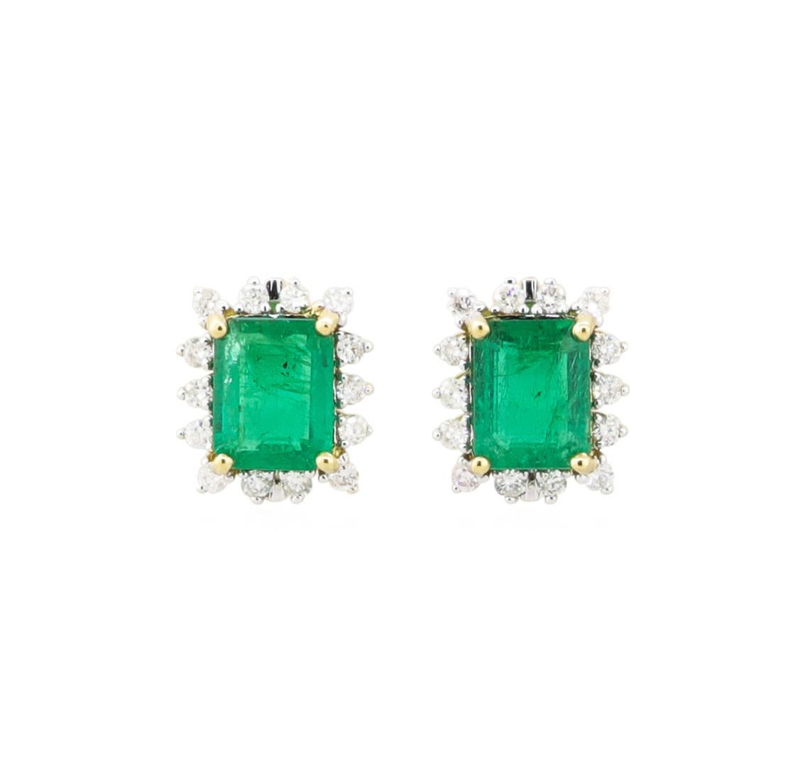 One pair electronically tested 18KT yellow gold ladies cast & assembled emerald & diamond earrings with screw backs. Each earring features an emerald set within a diamond floret. Bright polish finish with rhodium accents. Trademark is Orianne. Identified with markings of "18K". Condition is new, good workmanship. Containing: Two prong set rectangular step cut natural emeralds, measuring 8.80 x 6.90 x 4.10mm, exact total weight 4.18ct., clarity is moderately included, type III, medium, moderately strong, very slightly bluish green color, (GIA vslbG 5/4), cut is good. Transmitting light somewhat diffusely, transparent to translucent. Naturally occurring internal & external characteristics are present. Measurements are an average for the pair. Graded in the setting. Twenty-Eight prong set round brilliant cut diamonds exact total weight 28 Stones = 0.63ct. Graded in the setting. Clarity I-1 to I-2 Color G - I Total Weight of Colored Stones 4.18 ct. Total Weight of Diamonds 0.63 ct. Total Weight of Earrings 5.00 gm Estimated Retail Value $ 28,200.00 US AIG Appraised.