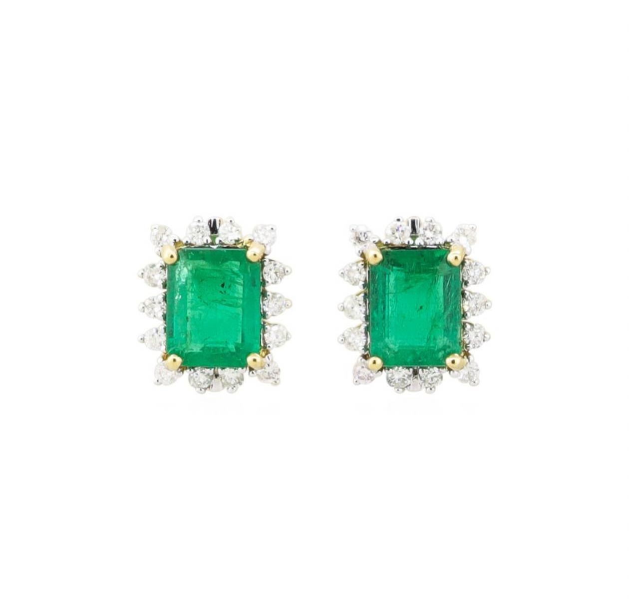 One pair electronically tested 18KT yellow gold ladies cast & assembled emerald & diamond earrings with screw backs. Each earring features an emerald set within a diamond floret. Bright polish finish with rhodium accents. Trademark is Orianne. Identified with markings of "18K". Condition is new, good workmanship. Containing: Two prong set rectangular step cut natural emeralds, measuring 8.80 x 6.90 x 4.10mm, exact total weight 4.18ct., clarity is moderately included, type III, medium, moderately strong, very slightly bluish green color, (GIA vslbG 5/4), cut is good. Transmitting light somewhat diffusely, transparent to translucent. Naturally occurring internal & external characteristics are present. Measurements are an average for the pair. Graded in the setting. Twenty-Eight prong set round brilliant cut diamonds exact total weight 28 Stones = 0.63ct. Graded in the setting. Clarity I-1 to I-2 Color G - I Total Weight of Colored Stones 4.18 ct. Total Weight of Diamonds 0.63 ct. Total Weight of Earrings 5.00 gm Estimated Retail Value $ 28,200.00 US