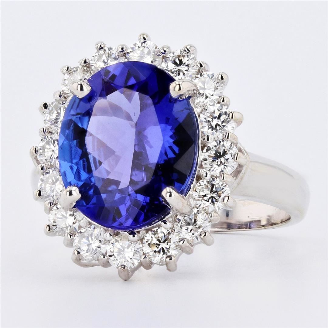 4.18ct Tanzanite and 1.03ctw Diamond 14K White Gold Ring. One polished, and tested, 14K white gold ring with a bright finish. The ring is mounted with: 1 genuine tanzanite center stone weighing approximately 4.18 carat, and 16 genuine round diamonds weighing approximately 1.03 carats. This item weighs 5.8 grams, condition is new, excellent workmanship. MAIN GEMSTONE Species: Zoisite Variety: Tanzanite Shape: Oval Cutting Style: Brilliant Cut Crown Modified Brilliant Cut Pavilion Measurements: 11.9 x 9.7 x 5.3mm Weight: 4.18 carat Color: Violetish Blue Cut Grade: Very Good Refractive Index: 1.691 - 1.700 DR Birefringence: 0.008 - 0.013 Hardness: 6.5 - 7 ADJACENT GEMSTONES ON RING Identity: Natural Diamond Shape: Round Cutting Style: Brilliant Cut Quantity: 16 Diamonds Average Diameter: 2.5 - 2.7mm Total Weight: 1.03 carats Clarity Grade: SI1 to SI2 Color Grade: G - H Refractive Index: 2.418 Hardness: 10 TANZANITE WEIGHT: 4.18ct TOTAL DIAMOND WEIGHT: 1.03ctw WEIGHT OF ITEM: 5.8 grams GOLD CONTENT: 14K White Gold