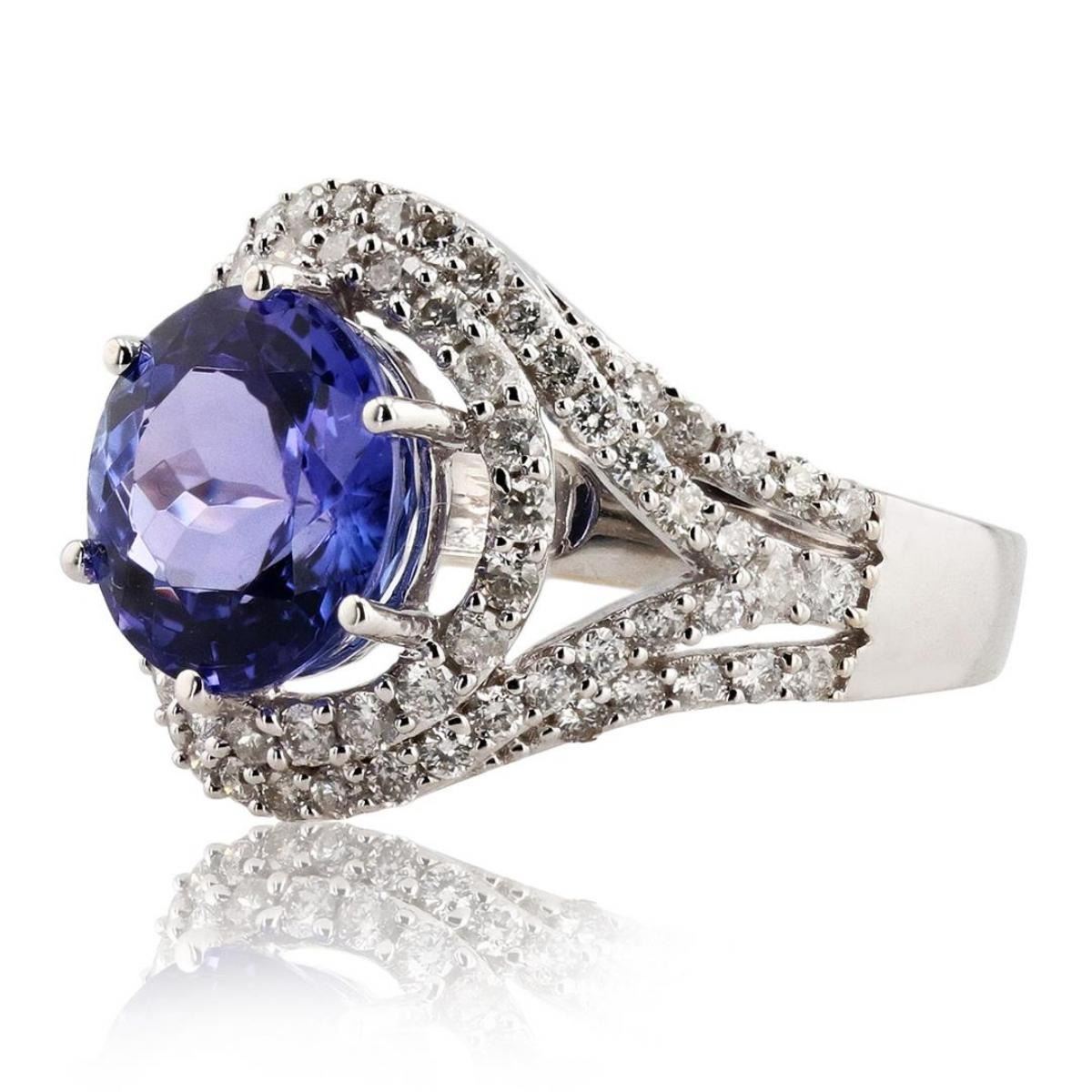 DESCRIPTION: ONE 14K STAMPED WHITE GOLD LADIES CUSTOM MADE DIAMOND & TANZANITE RING . 6.20 GR TW . CONTAINING: 1 - MAIN CENTER GEMSTONE(S): IDENTITY : ONE CENTER NATURAL TANZANITE SEE IN 6 PRONGS SETTING. CARAT WEIGHT : 4.18 CTW. SHAPE & MEASUREMEMT: ROUND CUT. APPROX : 9.94 MM. QUALITY : FINE MEDIUM BLUE/PURPLE , FINE CUT & CLARITY . 2 - ADJACENT GEMSTONES: IDENTITY : NATURAL DIAMONDS. SHAPE : ROUND BRILLIANT CUT. CARAT WEIGHT : 1.07 CTW. QUALITY : G/H COLOR , SI2/3 CLARITY . ALL FINE CUTTING AND PROPORTIONS. ALL PRONGS SETTINGS STYLE TOTAL GEMSTONES WEIGHT : 5.25 CTW TW.