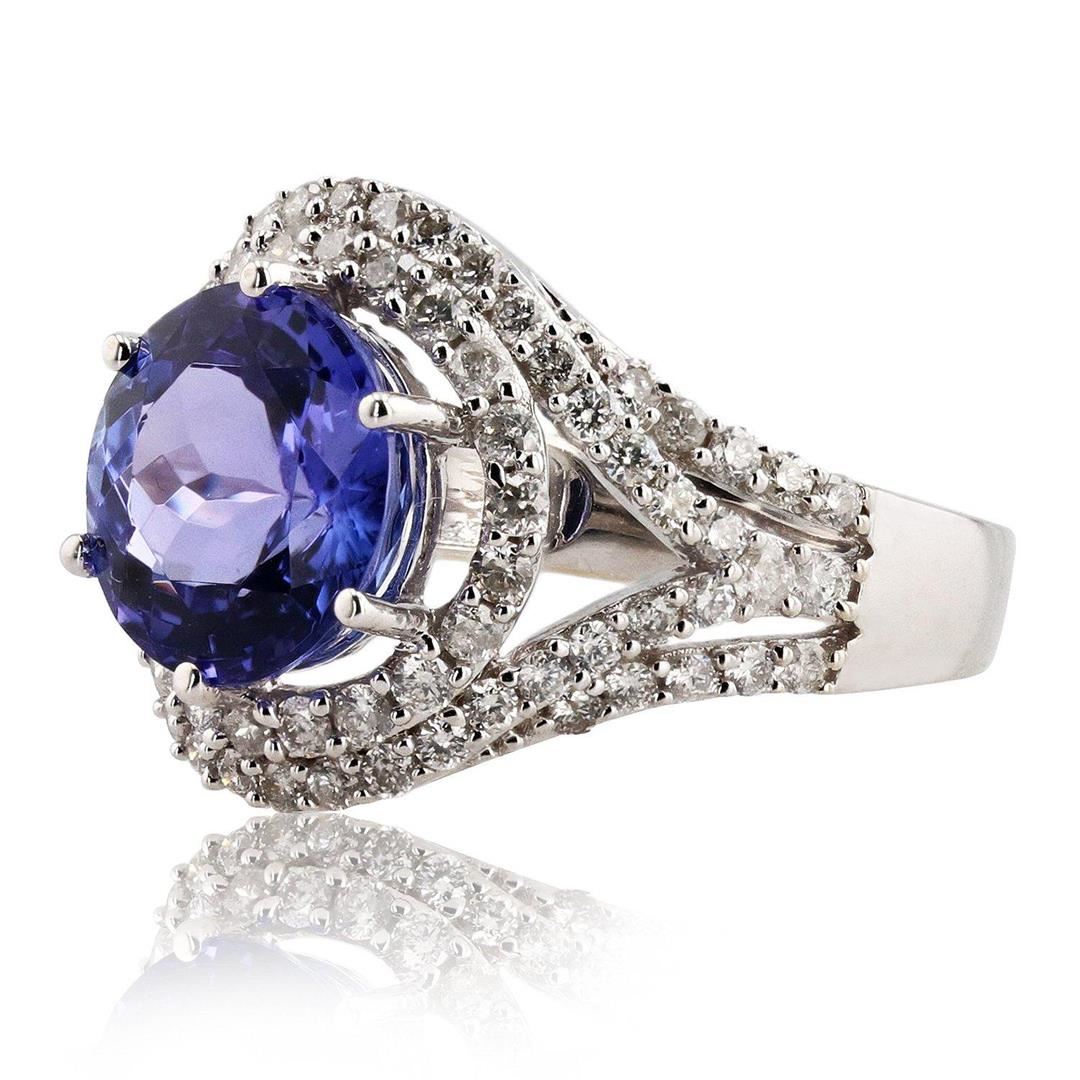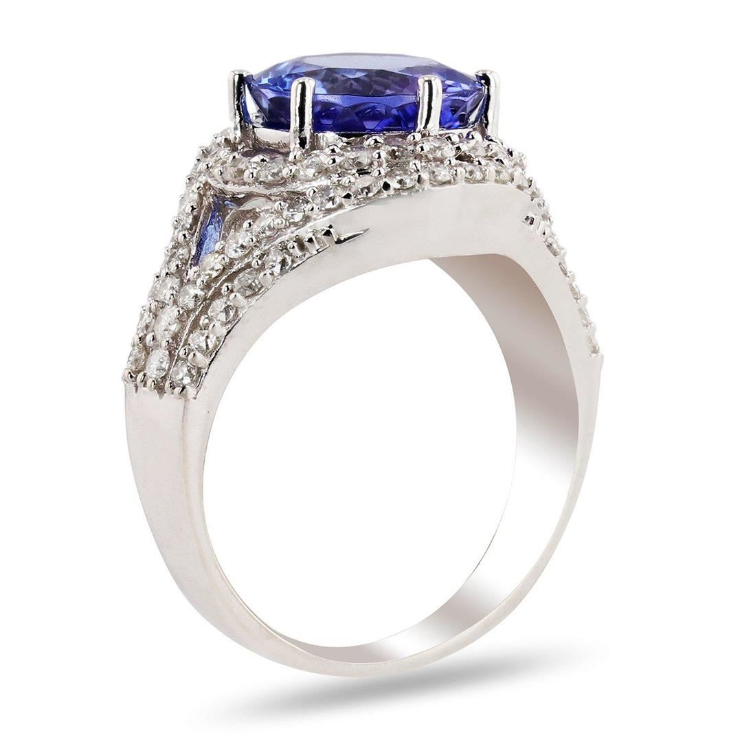 ONE 14K STAMPED WHITE GOLD LADIES CUSTOM MADE DIAMOND AND TANZANITE RING. 6.20 GR TW. 1 - MAIN CFNTER GEMSTONE(S) IDENTITY: ONE CENTER NATURAL TANZANITE SET IN 6 PRONGS SETTING. CARAT WEIGHT: 4.18 CTS. SHAPE AND MEASUREMEMT: ROUND CUT. APPROX: 9.94MM. QUALITY: FINE MEDIUM BLUE/PURPLE, FINE CUT AND CLARITY. 2 - ADJACENT GEMSTONES: IDENTITY: NATURAL DIAMONDS. SHAPE: ROUND BRILLIANT CUT. CARAT WEIGHT: 1.07 CT. QUALITY: G - H COLOR, SI2/3 CLARITY. ALL FINE CUTTING AND PROPORTIONS. ALL PRONGS SETTINGS STYLE. TOTAL GEMSTONES WEIGHT: 5.25 CTS TW.