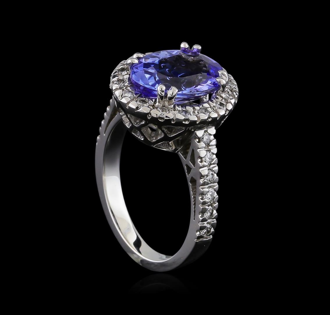 One electronically tested 14KT white gold lady's cast fashion ring with a basket halo with a bright polish finish. The featured lady's ring has a shank measuring 2.57 millimeters wide. Identified with markings of "14K". Condition is new, good workmanship. Containing: One prong set oval modified brilliant cut natural tanzanite, measuring 12.33 x 8.86 x 5.55mm, approximate weight of 4.18ct., clarity is eye clean, type I, medium, moderately strong, bluish violet color, (GIA bV 5/4), cut is very good. Transmitting light with no distortion, transparent. Colored gemstones are presumed to have been subjected to commonly used enhancement processes. Graded in the setting. Twenty-Eight prong set round brilliant cut diamonds, measuring 1.75 - 1.65 x 1.05mm (depth est.) approximate total weight of 28 Stones = 0.52ct. Graded in the setting. Clarity: SI-1 to SI-2. Color: H - I. Cut Good. Total Weight of Colored Stones 4.18ct. Total Weight of Diamonds 0.52ct. Total Weight of Ring 7.90gm. GAS Appraised at $8,930.00.