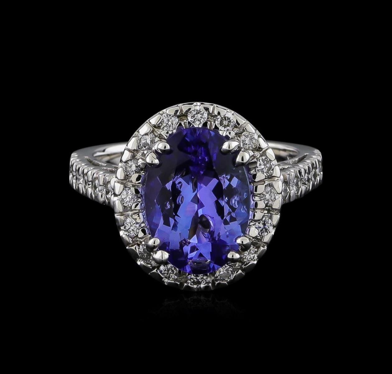 One electronically tested 14KT white gold lady's cast fashion ring with a basket halo with a bright polish finish. The featured lady's ring has a shank measuring 2.57 millimeters wide. Identified with markings of "14K". Condition is new, good workmanship. Containing: One prong set oval modified brilliant cut natural tanzanite, measuring 12.33 x 8.86 x 5.55mm, approximate weight of 4.18ct., clarity is eye clean, type I, medium, moderately strong, bluish violet color, (GIA bV 5/4), cut is very good. Transmitting light with no distortion, transparent. Colored gemstones are presumed to have been subjected to commonly used enhancement processes. Graded in the setting. Twenty-Eight prong set round brilliant cut diamonds, measuring 1.75 - 1.65 x 1.05mm (depth est.) approximate total weight of 28 Stones = 0.52ct. Graded in the setting. Clarity: SI-1 to SI-2. Color: H - I. Cut Good. Total Weight of Colored Stones 4.18ct. Total Weight of Diamonds 0.52ct. Total Weight of Ring 7.90gm. GAS Appraised.