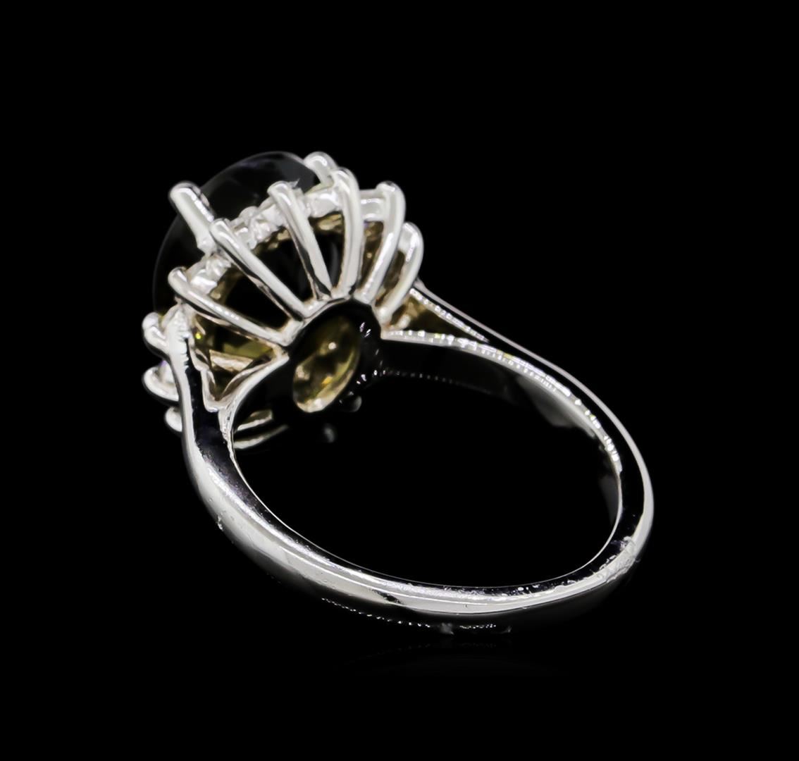 One ring featuring: 14KT white gold weighing 4.89 grams containing one green tourmaline with a total weight of 4.18ct and side diamonds with a total weight of 0.69ct.