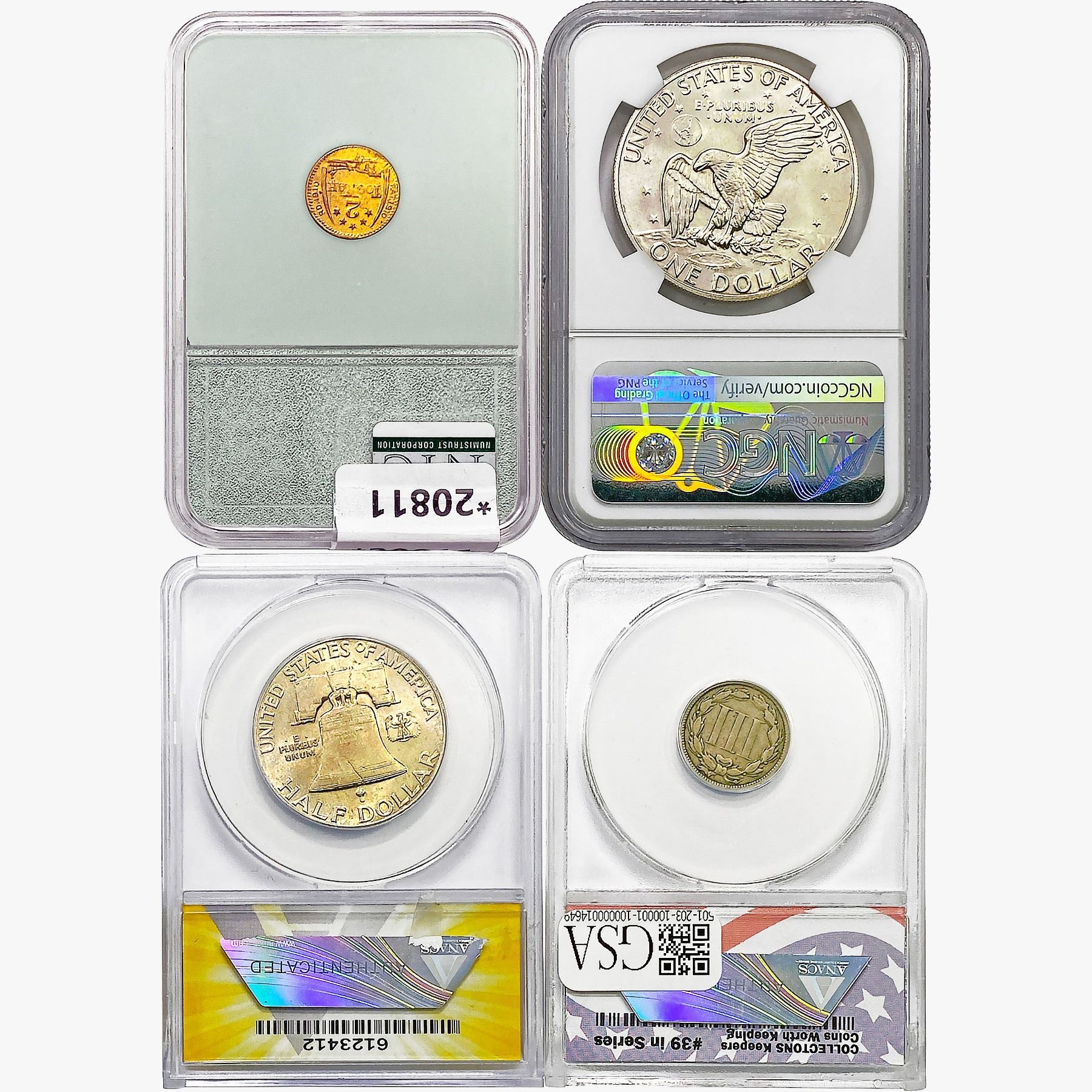 e. Coins sold referencing a third-party grading service are sold “AS IS” without any express or implied warranty, except for a guarantee by GSA that they are genuine. Removal or alteration of the holder, voids all of Bidder’s claims concerning that Product. Certain warranties may be available from the grading services and Bidders are referred to them for further details: Numismatic Guaranty Corporation (NGC), PO Box 4776, Sarasota, FL 34230, www.ngccoin.com/services/writtenguarantee.asp; Professional Coin Grading Services (PCGS), PO Box 9458, Newport Beach, CA 92658, www.pcgs.com/guarantee.html; ANACS, 6555 S. Kenton St., Ste. 303, Englewood, CO 80111; and Independent Coin Grading Co. (ICG), 7901 East Bellview, Ave., Suite 50, Englewood, CO 80111.