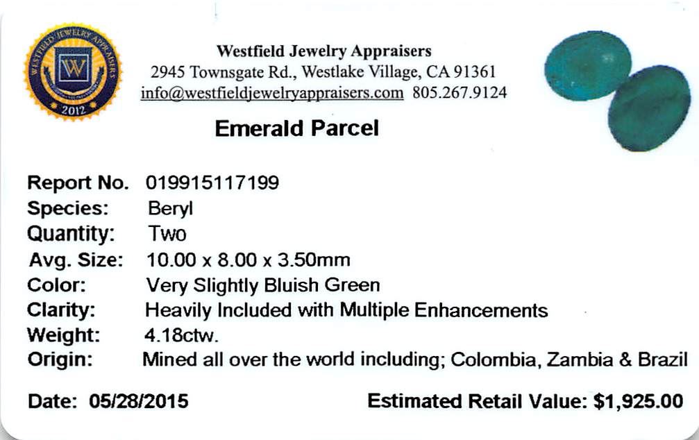 Two oval mixed cut natural emeralds, measuring 10.00 x 8.00 x 3.50mm, exact total weight 4.18ct., clarity is heavily included, type III, medium dark, very slightly grayish, very slightly bluish green color, (GIA vslbG 6/3), cut is good. Transmitting light somewhat diffusely, translucent, Naturally occurring internal & external characteristics are present, Indications of multiple laboratory enhancements, including high temperature heat treatment. Westfield Appraised at $1,925.00.