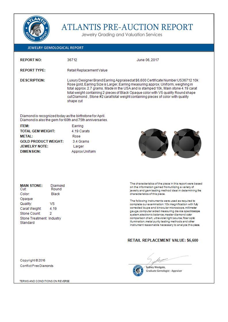 4.19 CTW Fancy Black VS Diamond Solitaire Stud Earrings 10K Rose Gold ---- Luxury Designer Brand Earring Appraised Retail Price at $6,600 ---- SKU Number US36712 10k Rose gold Earring Size is Larger, Earring measuring approx. Uniform, weighing in total approx. 2.7 grams. Made in the USA and is stamped 10k, Main stone 4.19 carat total weight containing 2 pieces of Black Opaque color with VS quality Round shape cut Diamond , Stone #2 carat total weight containing pieces of color with quality shape cut