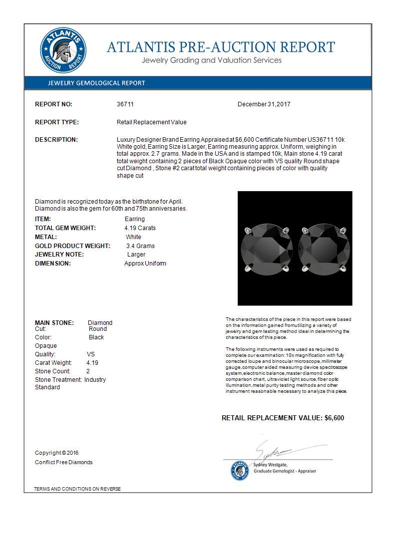 REF-82A6X -36711 ---- 4.19 CTW Fancy Black VS Diamond Solitaire Stud Earrings 10K White Gold ---- Luxury Designer Brand Earring Appraised at $6,600 Certificate Number US36711 10k White gold, Earring Size is Larger, Earring measuring approx. Uniform, weighing in total approx. 2.7 grams. Made in the USA and is stamped 10k, Main stone 4.19 carat total weight containing 2 pieces of Black Opaque color with VS quality Round shape cut Diamond , Stone #2 carat total weight containing pieces of color with quality shape cut