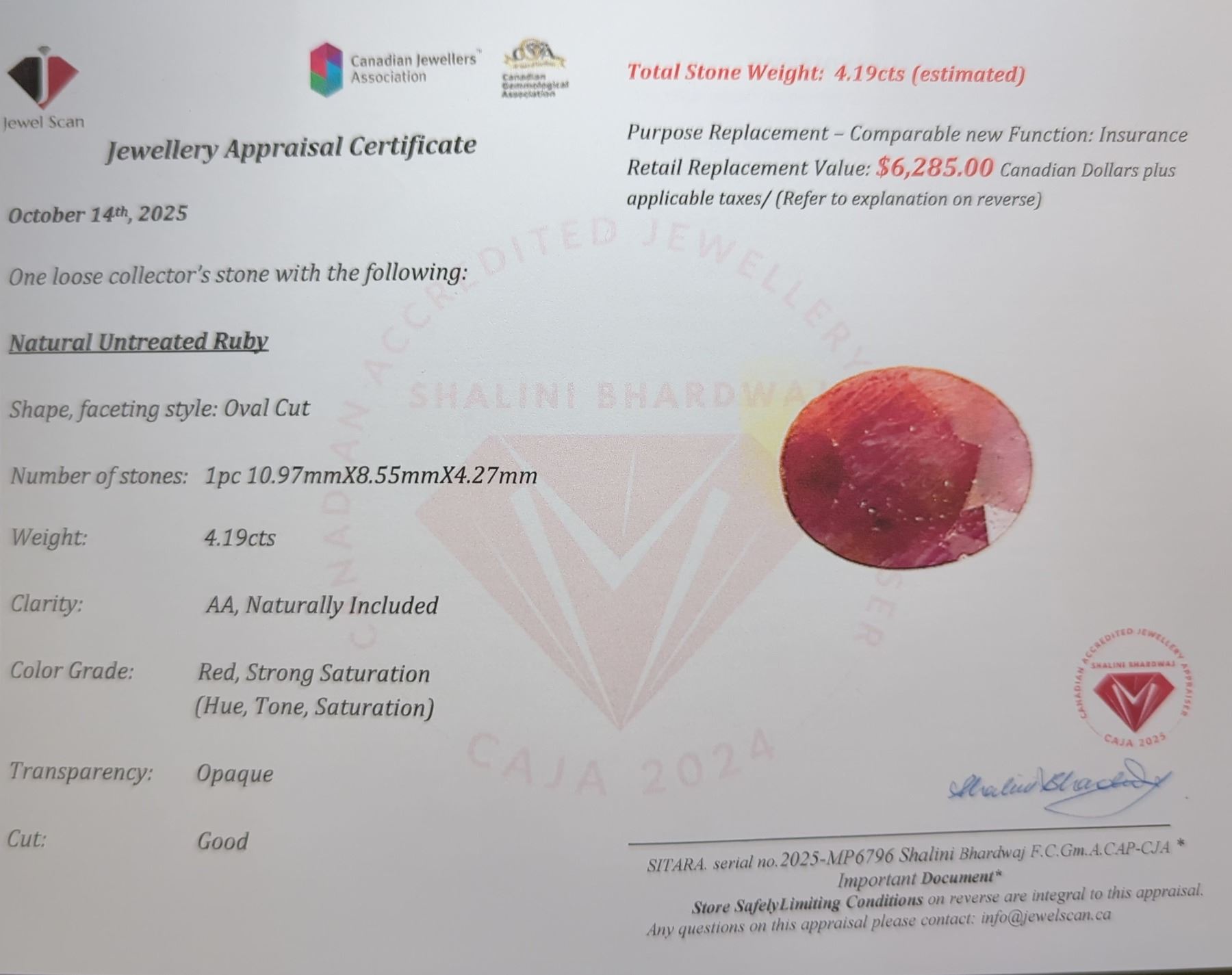 4.19 ct Certified Untreated Ruby gemstone ($6,285 Appraisal)