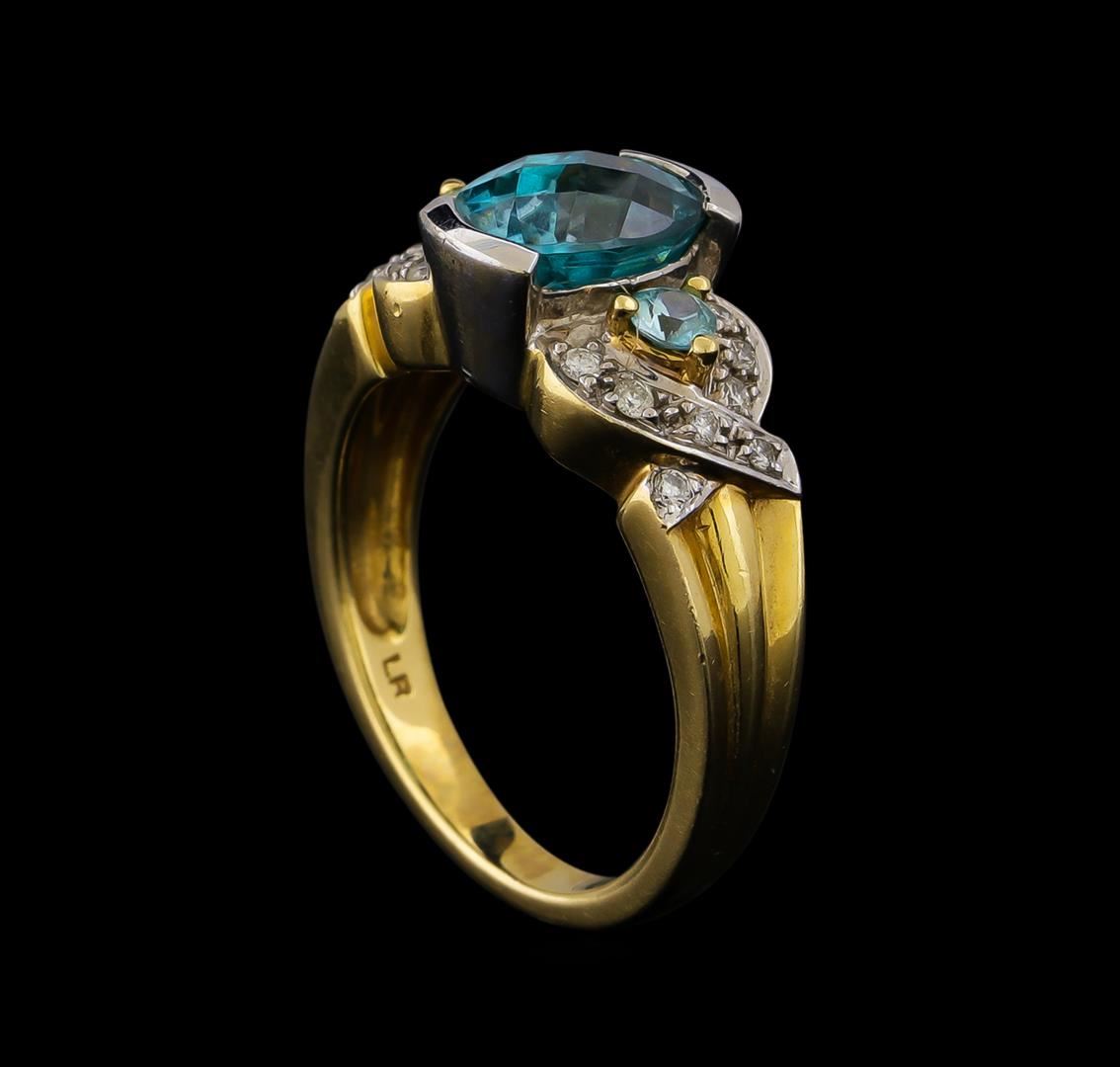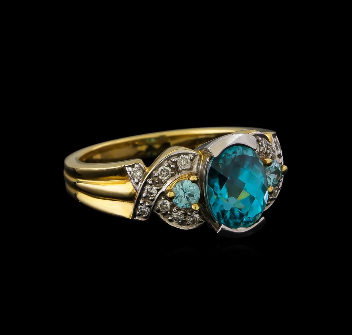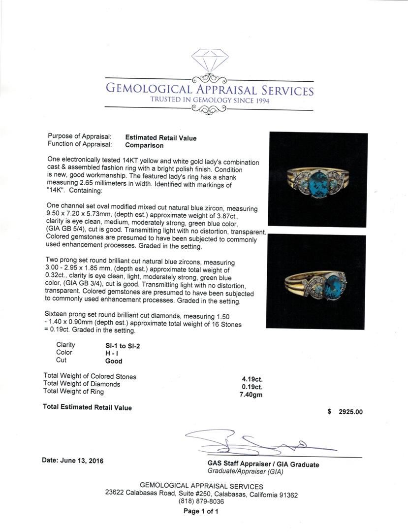 One electronically tested 14KT yellow and white gold lady's combination cast & assembled fashion ring with a bright polish finish. The featured lady's ring has a shank measuring 2.65 millimeters in width. Identified with markings of "14K". Condition is new, good workmanship. Containing: One channel set oval modified mixed cut natural blue zircon, measuring 9.50 x 7.20 x 5.73mm, (depth est.) approximate weight of 3.87ct., clarity is eye clean, medium, moderately strong, green blue color, (GIA GB 5/4), cut is good. Transmitting light with no distortion, transparent. Colored gemstones are presumed to have been subjected to commonly used enhancement processes. Graded in the setting. Two prong set round brilliant cut natural blue zircons, measuring 3.00 - 2.95 x 1.85 mm, (depth est.) approximate total weight of 0.32ct., clarity is eye clean, light, moderately strong, green blue color, (GIA GB 3/4), cut is good. Transmitting light with no distortion, transparent. Colored gemstones are presumed to have been subjected to commonly used enhancement processes. Graded in the setting. Sixteen prong set round brilliant cut diamonds, measuring 1.50 - 1.40 x 0.90mm (depth est.) approximate total weight of 16 Stones = 0.19ct. Graded in the setting. Clarity: SI-1 to SI-2. Color: H - I. Cut Good. Total Weight of Colored Stones 4.19ct. Total Weight of Diamonds 0.19ct. Total Weight of Ring 7.40gm. GAS Appraised at $2,925.00.
