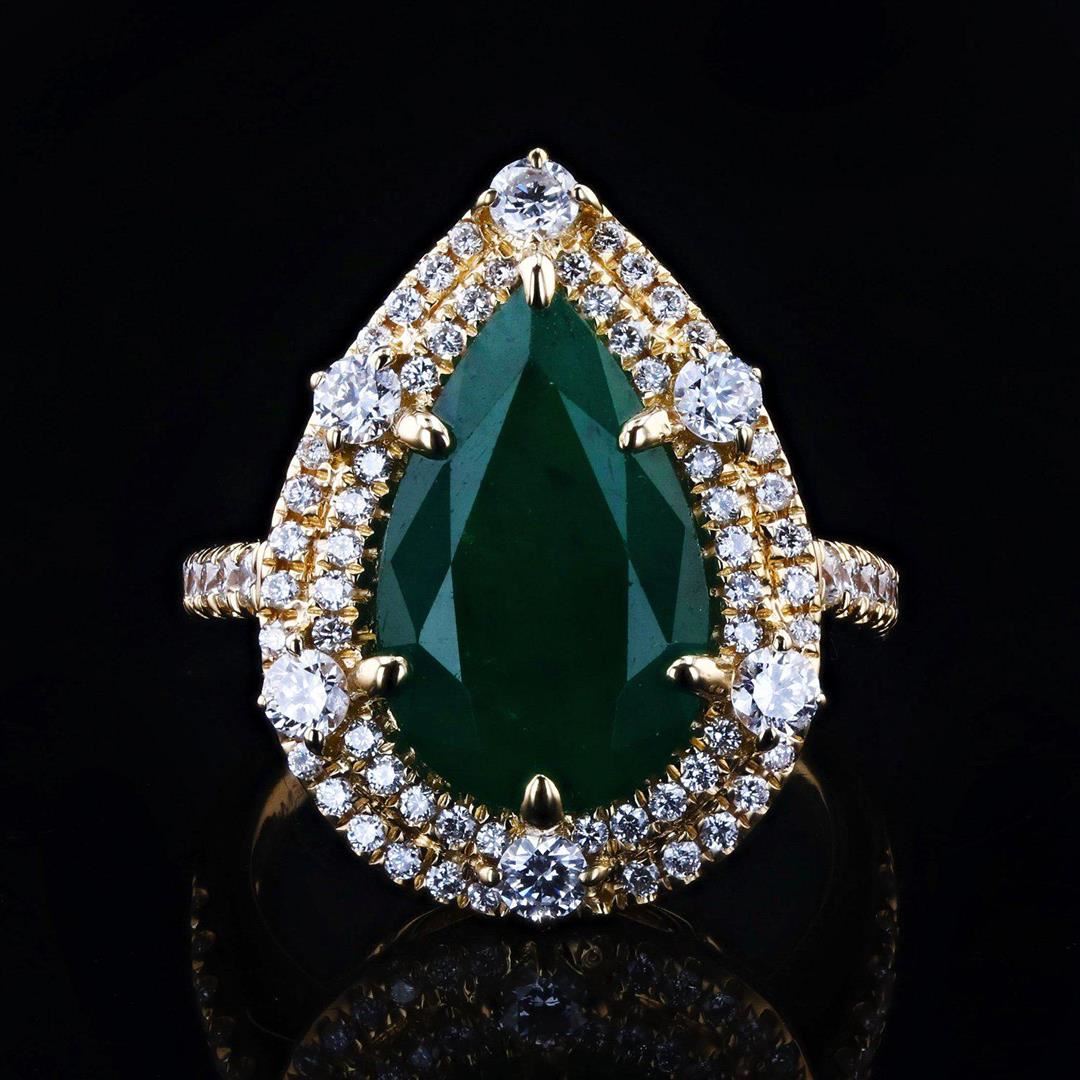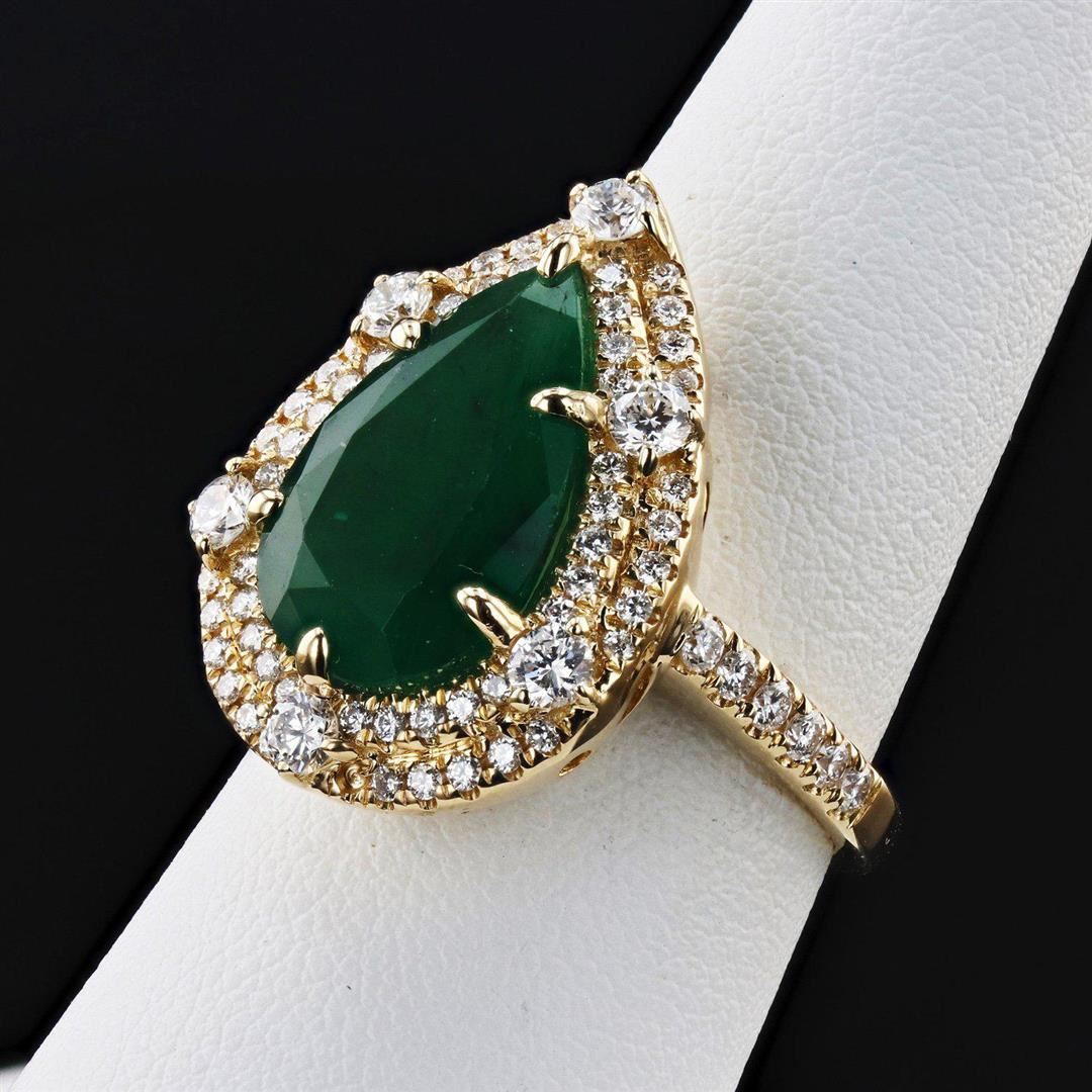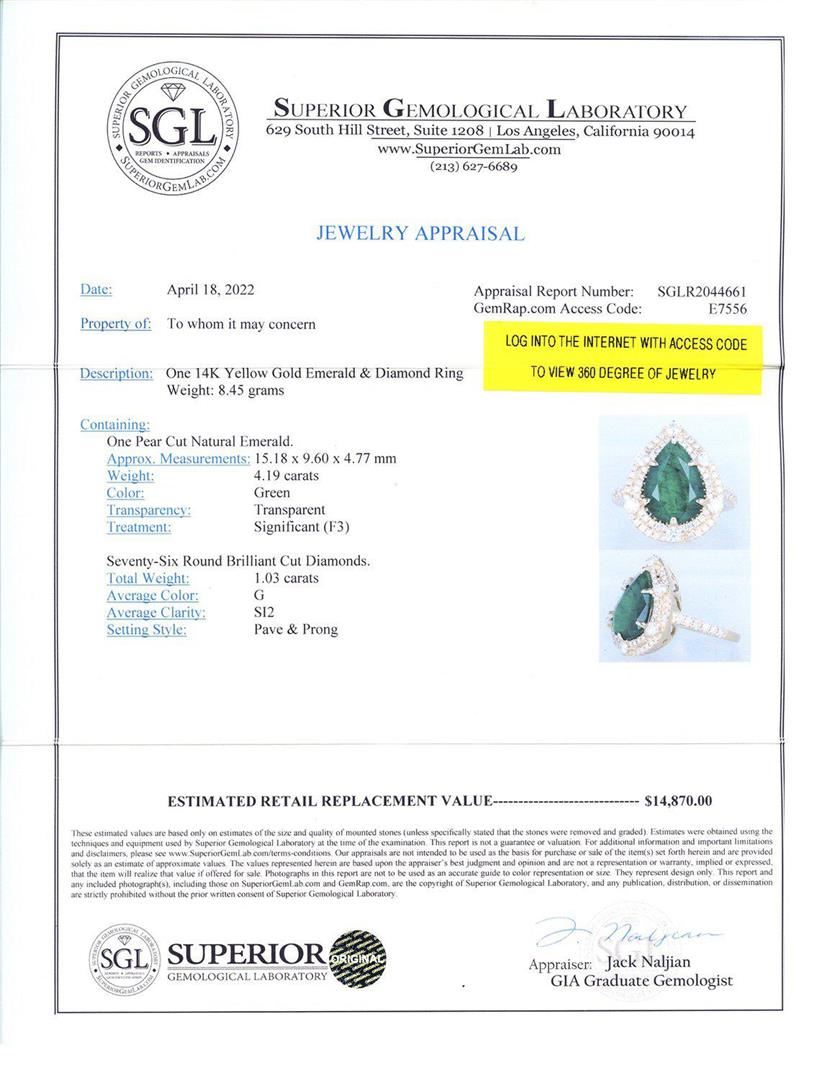 One 14K Yellow Gold Emerald & Diamond Ring Weight: 8.45 grams One Pear Cut Natural Emerald Approx. Measurements: 15.18 x 9.60 x 4.77mm 4.19 carats Color: Green Transparency: Transparent Treatment: Significant (F3) Seventy-Six Round Brilliant Cut Diamonds