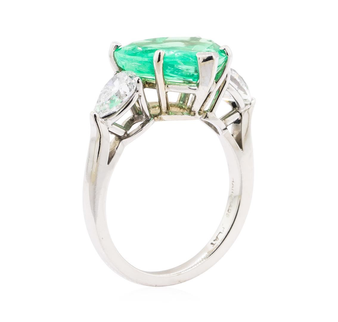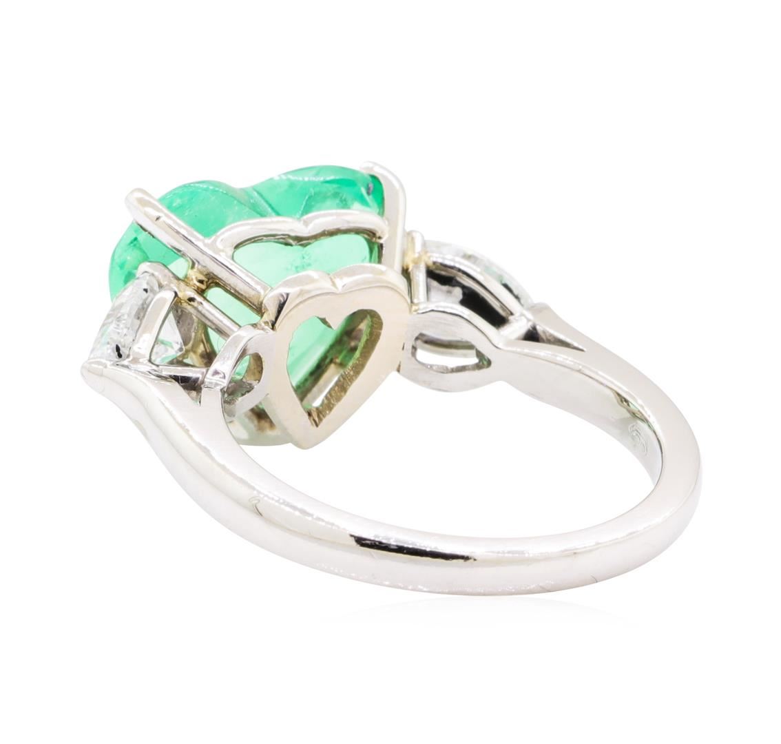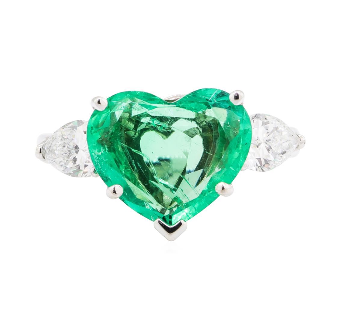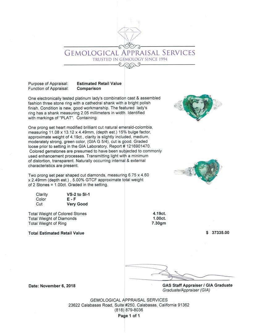 One electronically tested platinum lady's combination cast & assembled fashion three stone ring with a cathedral shank with a bright polish finish. The featured lady's ring has a shank measuring 2.05 millimeters in width. Identified with markings of 'PLAT'. Condition is new, good workmanship. Containing: One prong set heart modified brilliant cut natural emerald-colombia, measuring 11.08 x 13.12 x 4.49mm, (depth est.) 15%. bulge factor, approximate weight of 4.19ct., clarity is slightly included, medium, moderately strong, green color, (GIA G 5/4), cut is good. Graded loose prior to setting in the GIA Laboratory, Report # 1216901470. Colored gemstones are presumed to have been subjected to commonly used enhancement processes. Transmitting light with a minimum of distortion, transparent. Naturally occurring internal & external characteristics are present. Two prong set pear shaped cut diamonds, measuring 6.75 x 4.60 x 2.49mm (depth est.) , 5.00.%. GTCF approximate total weight of 2 Stones = 1.00ct. Graded in the setting. Color E - F Clarity VS-2 to SI-1 Cut Very Good. Total Weight of Colored Stones 4.19ct.. Total Weight of Diamonds 1.00ct.. Total Weight of Ring 7.30gm GAS Appraised at $37335.00. GAS Appraised.