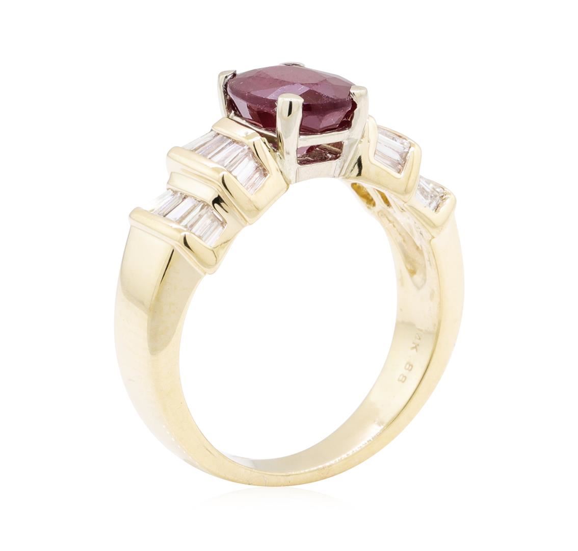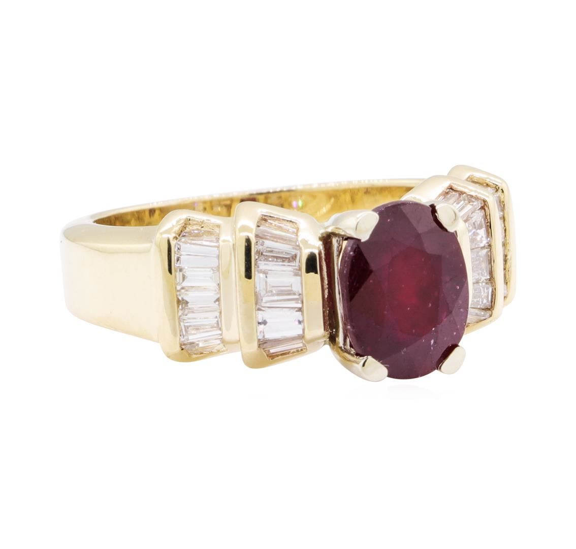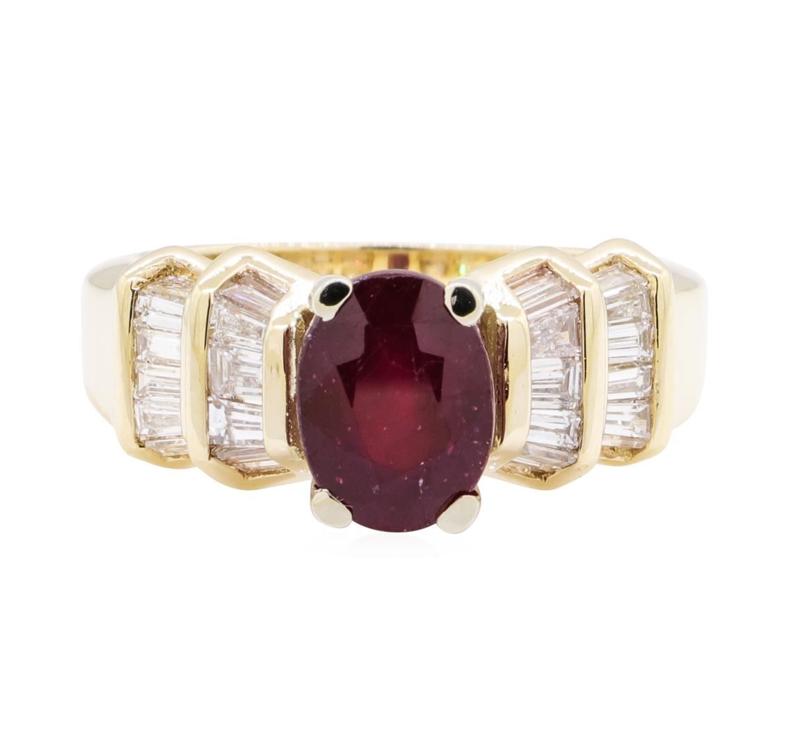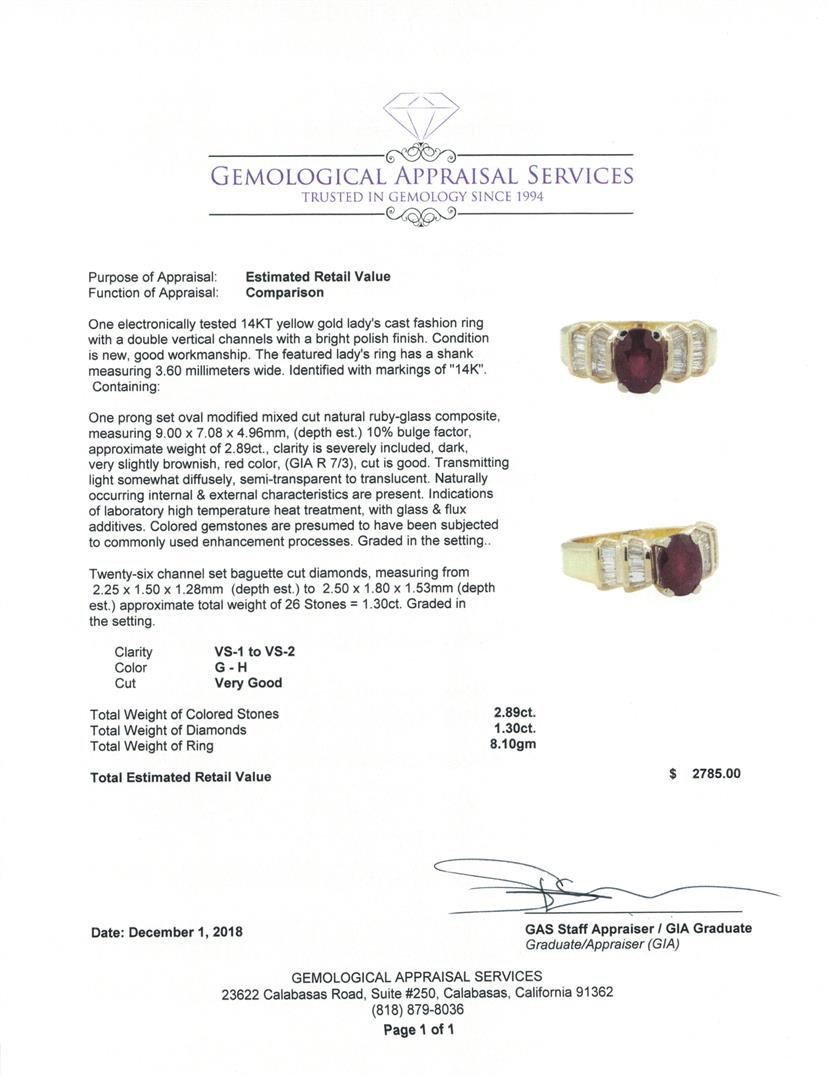 One electronically tested 14KT yellow gold lady's cast fashion ring with a double vertical channels with a bright polish finish. The featured lady's ring has a shank measuring 3.60 millimeters wide. Identified with markings of '14K'. Condition is new, good workmanship. Containing: One prong set oval modified mixed cut natural ruby-glass composite, measuring 9.00 x 7.08 x 4.96mm, (depth est.) 10%. bulge factor, approximate weight of 2.89ct., clarity is severely included, dark, very slightly brownish, red color, (GIA R 7/3), cut is good. Transmitting light somewhat diffusely, semi-transparent to translucent. Naturally occurring internal & external characteristics are present. Indications of laboratory high temperature heat treatment, with glass & flux additives. Colored gemstones are presumed to have been subjected to commonly used enhancement processes. Graded in the setting. Twenty-Six channel set baguette cut diamonds, measuring from 2.25 x 1.50 x 1.28mm (depth est.) to 2.50 x 1.80 x 1.53mm (depth est.) approximate total weight of 26 Stones = 1.30ct. Graded in the setting. Color G - H Clarity VS-1 to VS-2 Cut Very Good. Total Weight of Colored Stones 2.89ct.. Total Weight of Diamonds 1.30ct.. Total Weight of Ring 8.10gm GAS Appraised at $2785.00. GAS Appraised at $2,785.00.