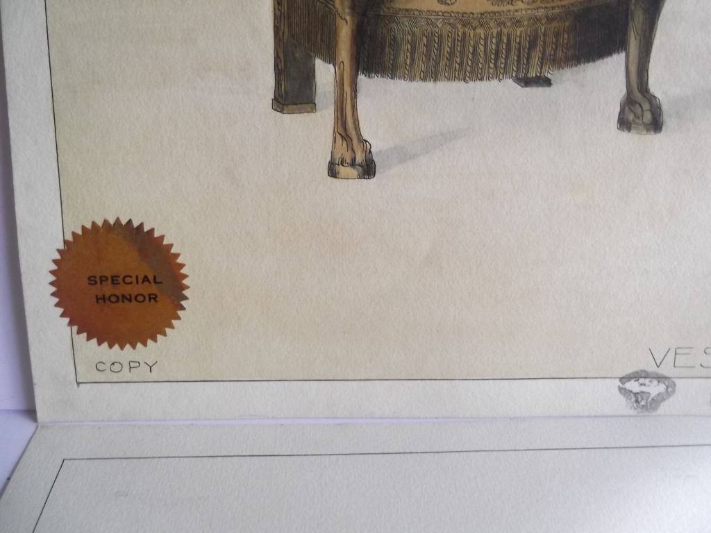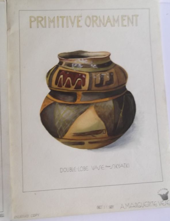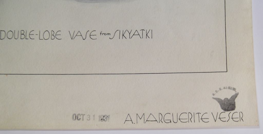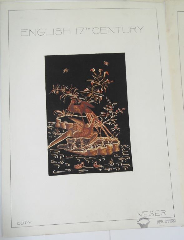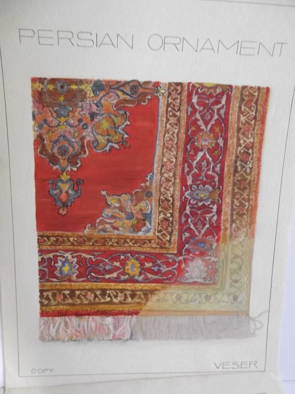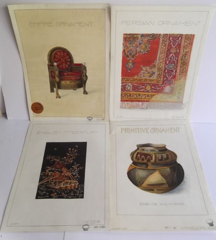 4 1930's illustrations by Marguerite Veser (Hugo R.B. Newman's wife), illustrations for Persian Ornament rug; Empire Ornament chair; English 17th Century birds 1932; Primitive Ornament vase. 10 inches x 13 1/2 inches.