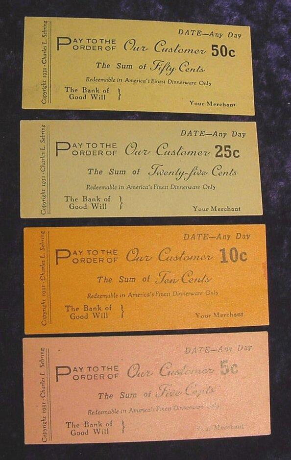 (4) 1931 Depression Script, 5c, 10c, 25c