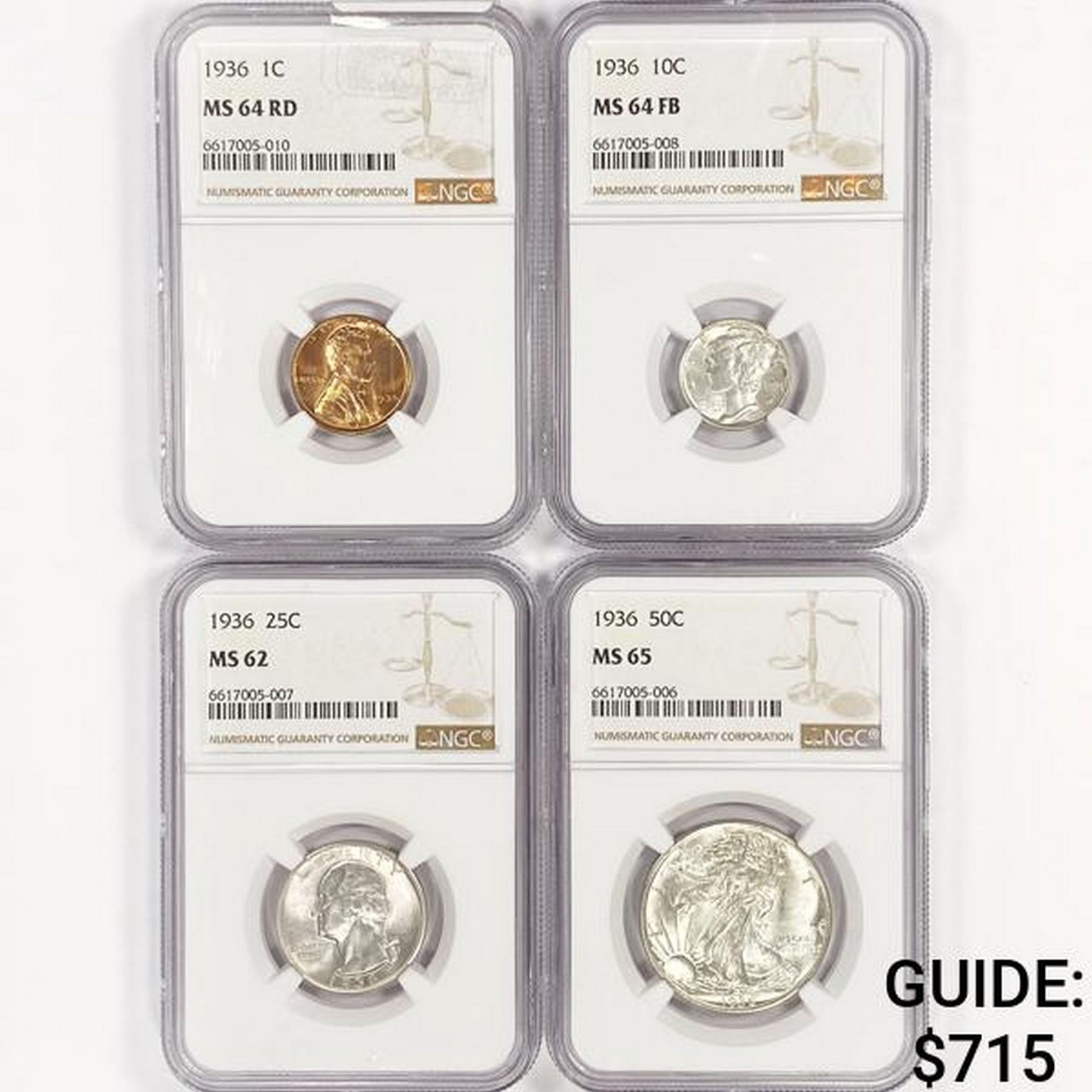 (4) 1936 US Coin Set (50C, 25C, 10C, 1C) NGC MS