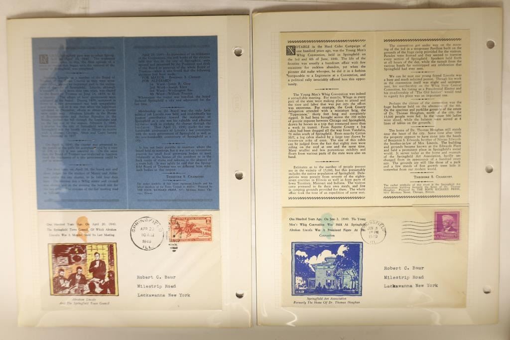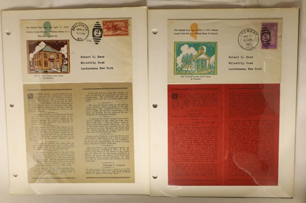 CANCELLED STAMPS AND INFORMATIONAL SHEET. 1940 OLD ST. CLAIR COUNTY COURTHOUSE AT BELLEVILLE, 1940 ABRAHAM LINCOLN AND THE SPRINGFIELD TOWN COUNCIL, 1940 OLD TAZEWELL COUNTY COURTHOUSE AT TREMONT AND 1940