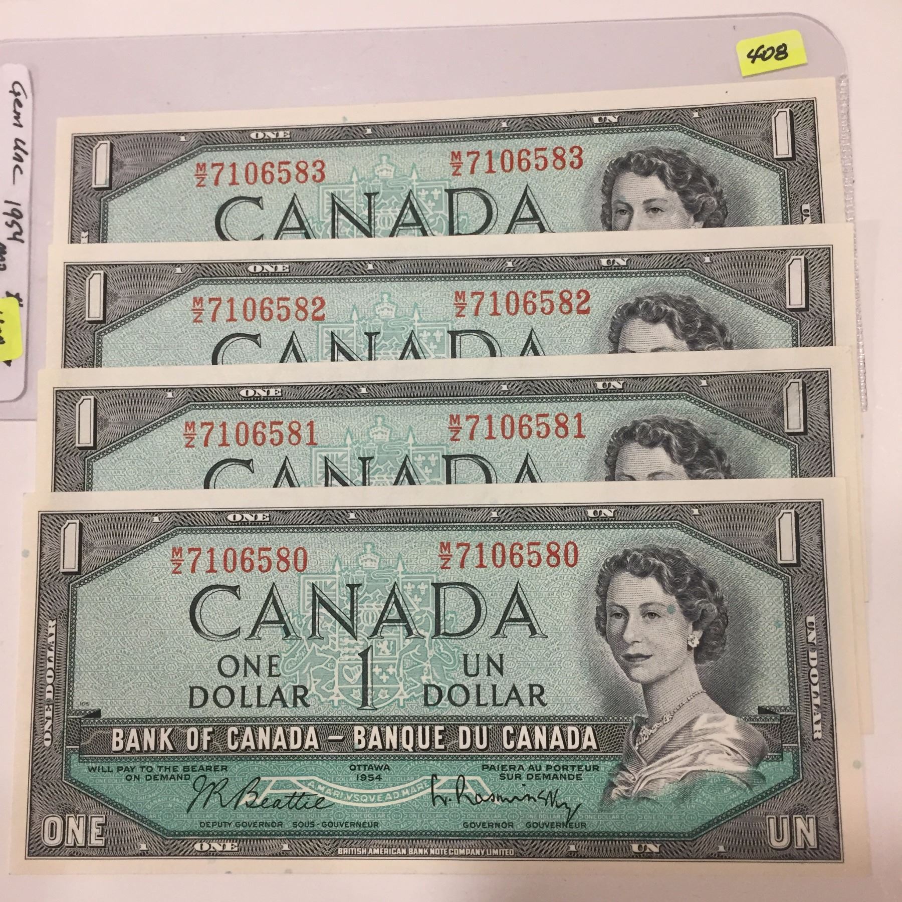 4 - 1954 Bk of Canada One Dollar Bills; Consecutive SN's; Uncirc.